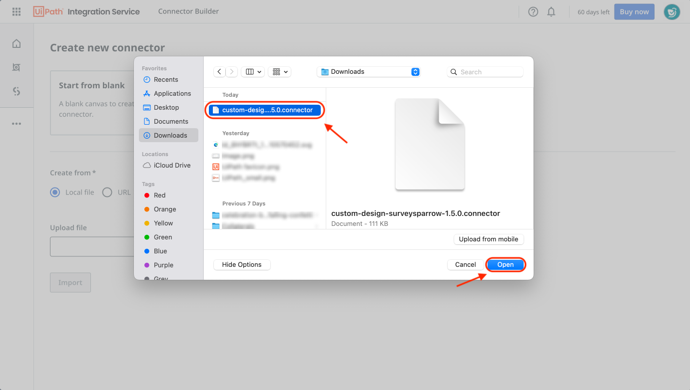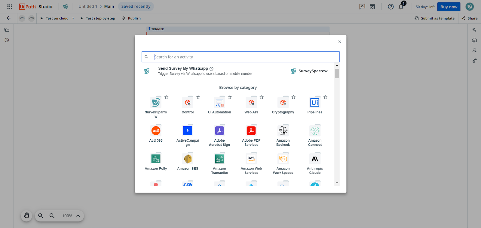 Note: A connector is a 3rd party app integration that connects your account to UiPath. In the case of SurveySparrow, you will first have to set up the connector inside UiPath before connecting your SurveySparrow account to UiPath.