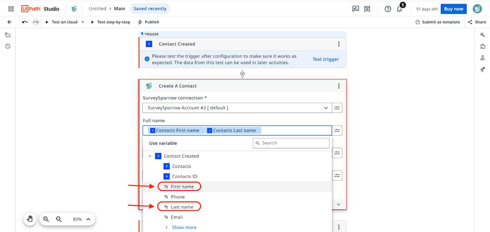 - When filling in the fields for the 2nd (or more) SurveySparrow activity, you can choose variables from the trigger or from SurveySparrow.