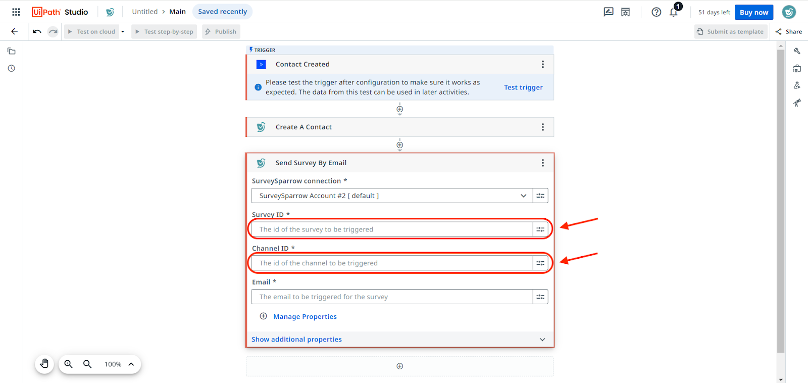 - Take a look at the URL. The Survey ID is the serial number appearing after /survey/ and the Channel ID is the number that appears after /channels/. Copy-paste both of these numbers into the corresponding activity fields in UiPath.