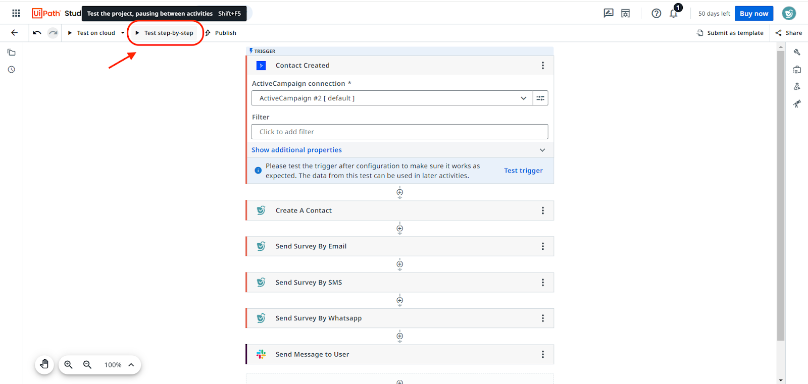 - Once you have built out the workflow, click on Test step-by-step to troubleshoot each activity.