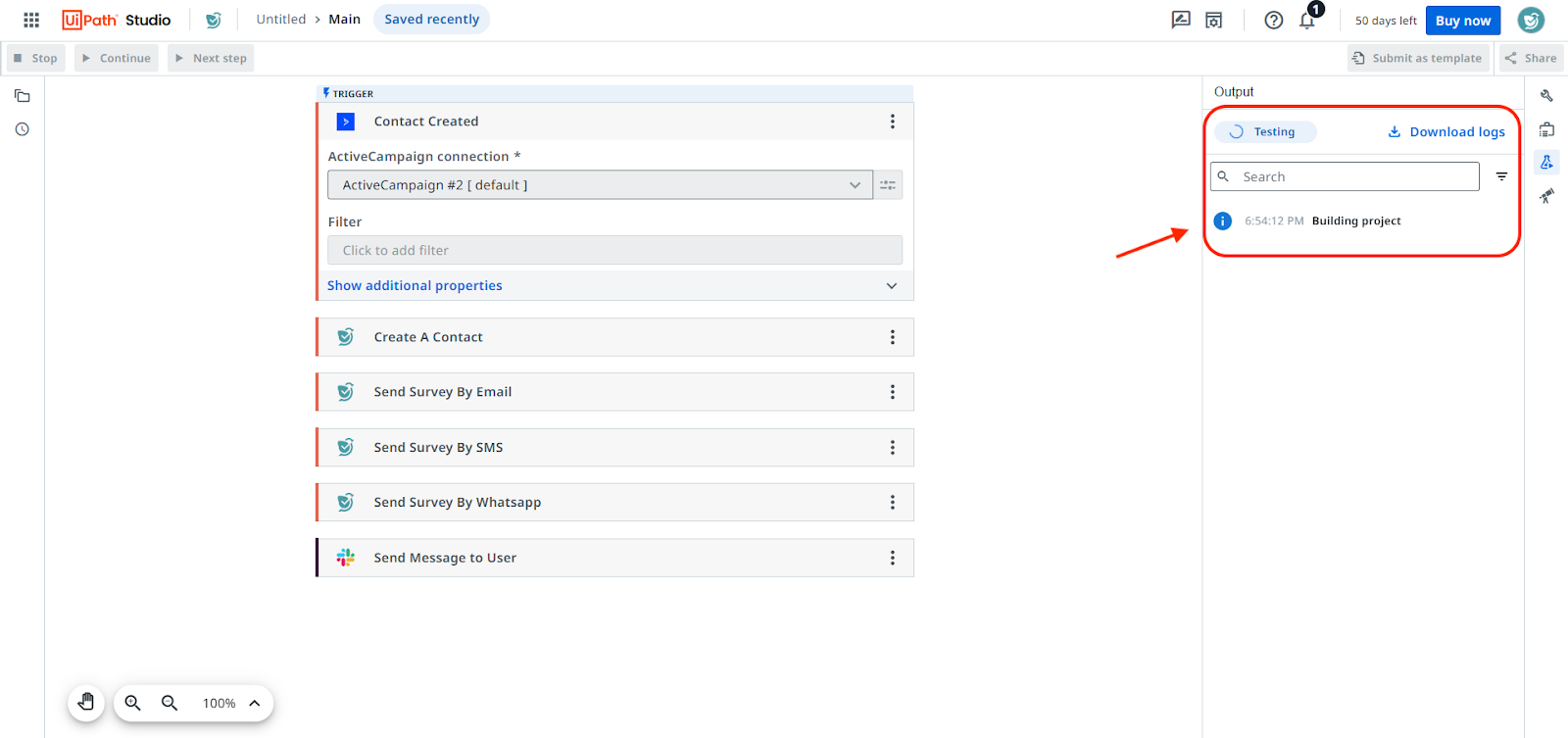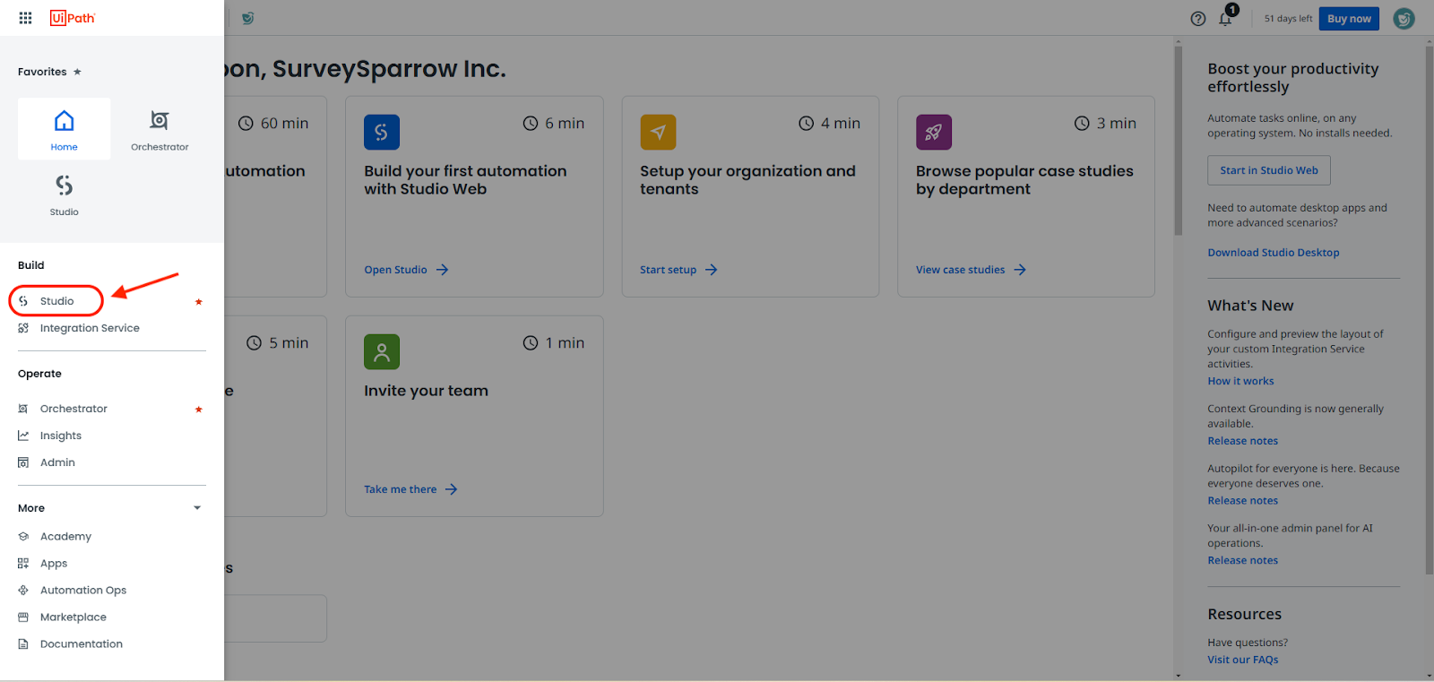 To create workflows, you will need to visit UiPath Studio. For the purpose of this article, we will be creating a workflow where new leads in ActiveCampaign are automatically added to SurveySparrow.