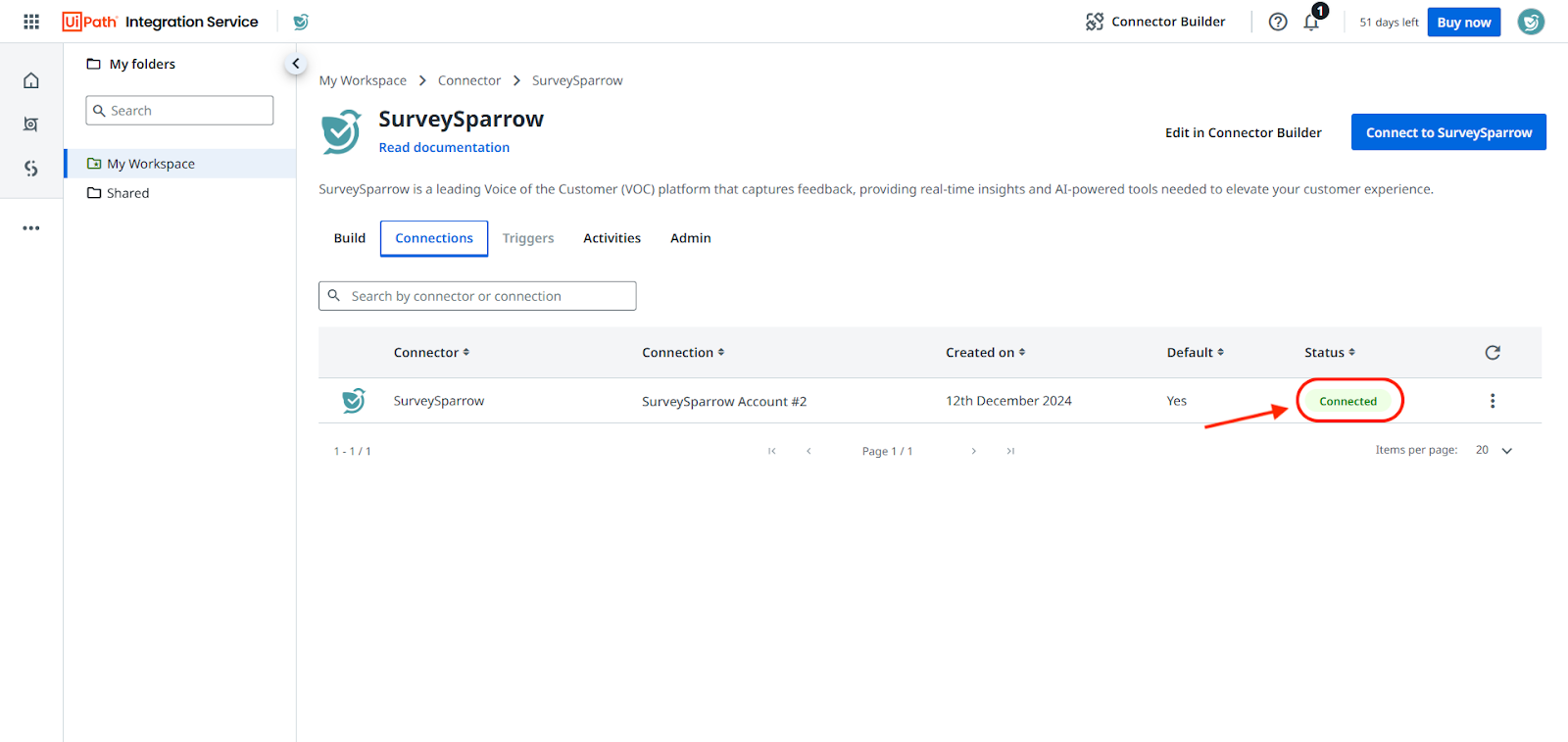 - After this, you will be returned to the SurveySparrow connector page. Under the Connections tab, you will see your account with the status Connected.