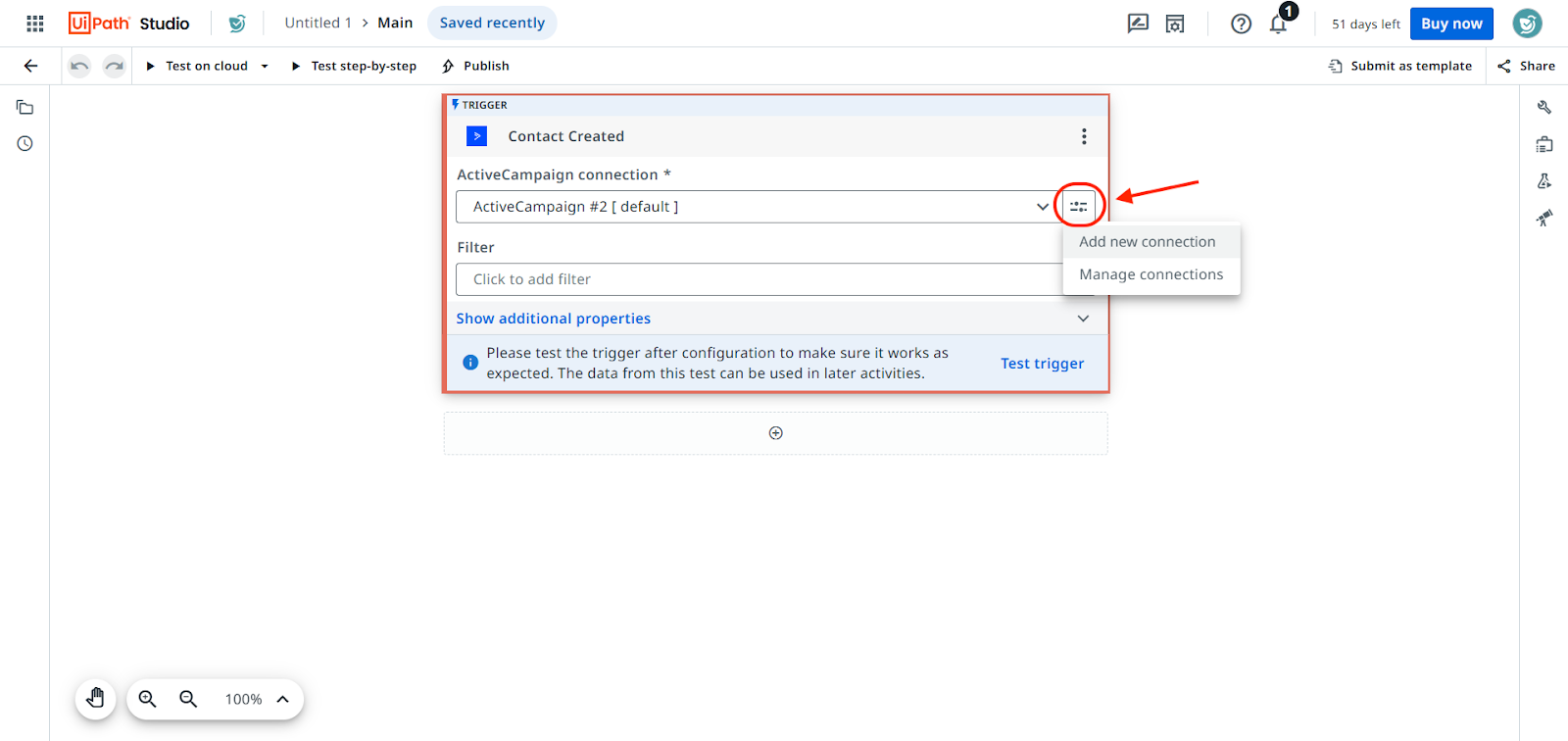 - The trigger is now ready. If you would like to change the connection or add a new one, click on the menu button in the right end of the connection field.