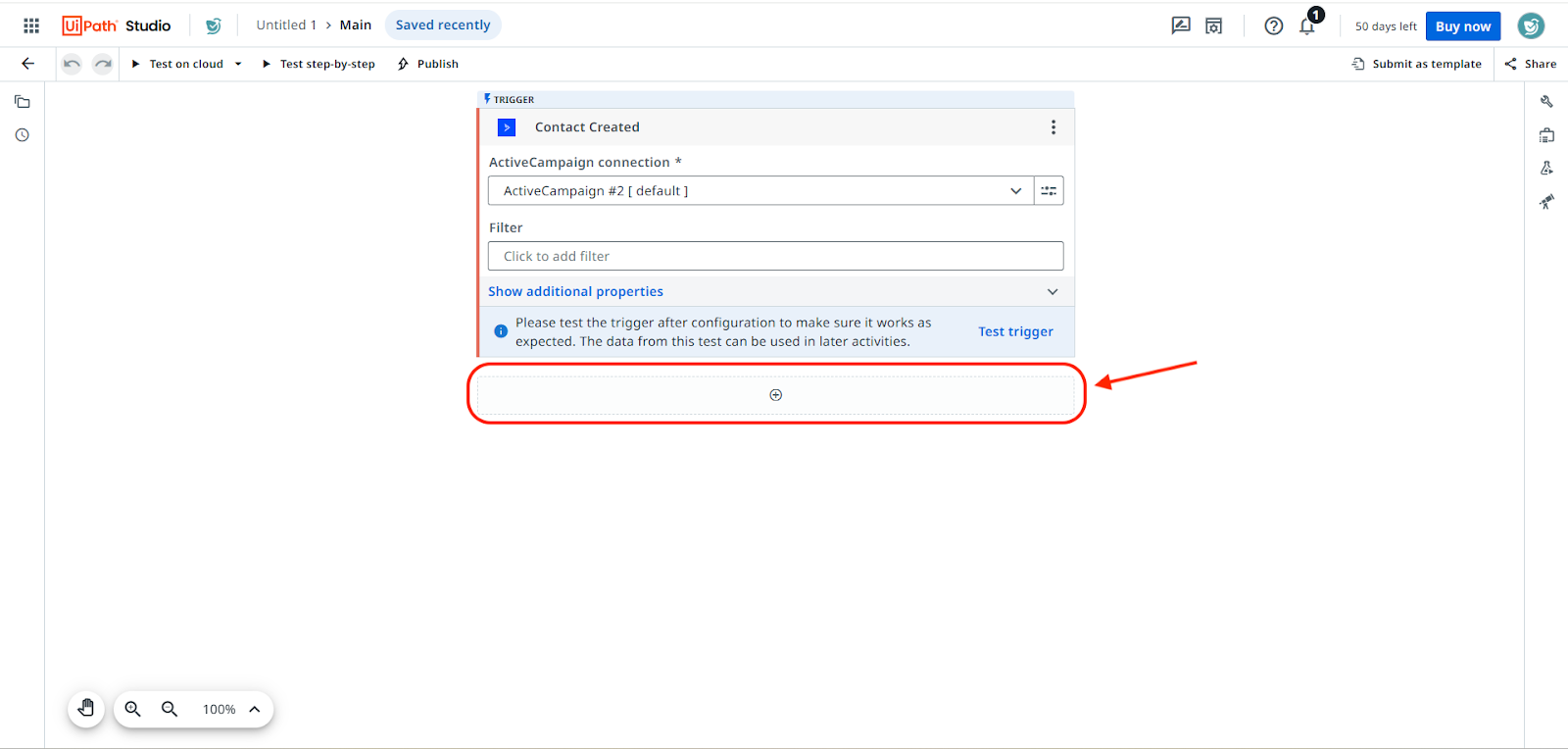 - To build out the rest of the workflow, click on the plus icon below the trigger.
