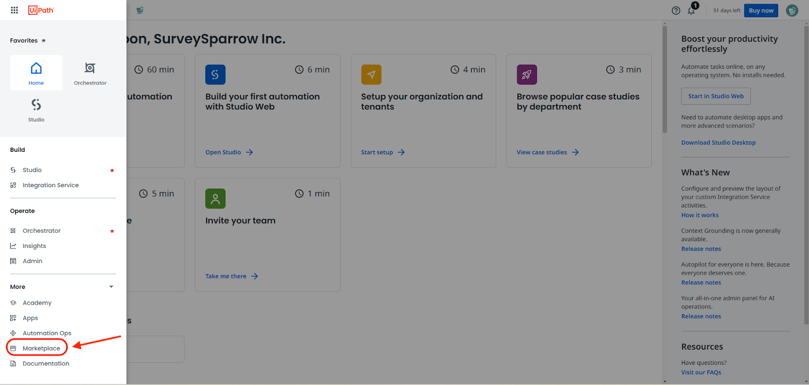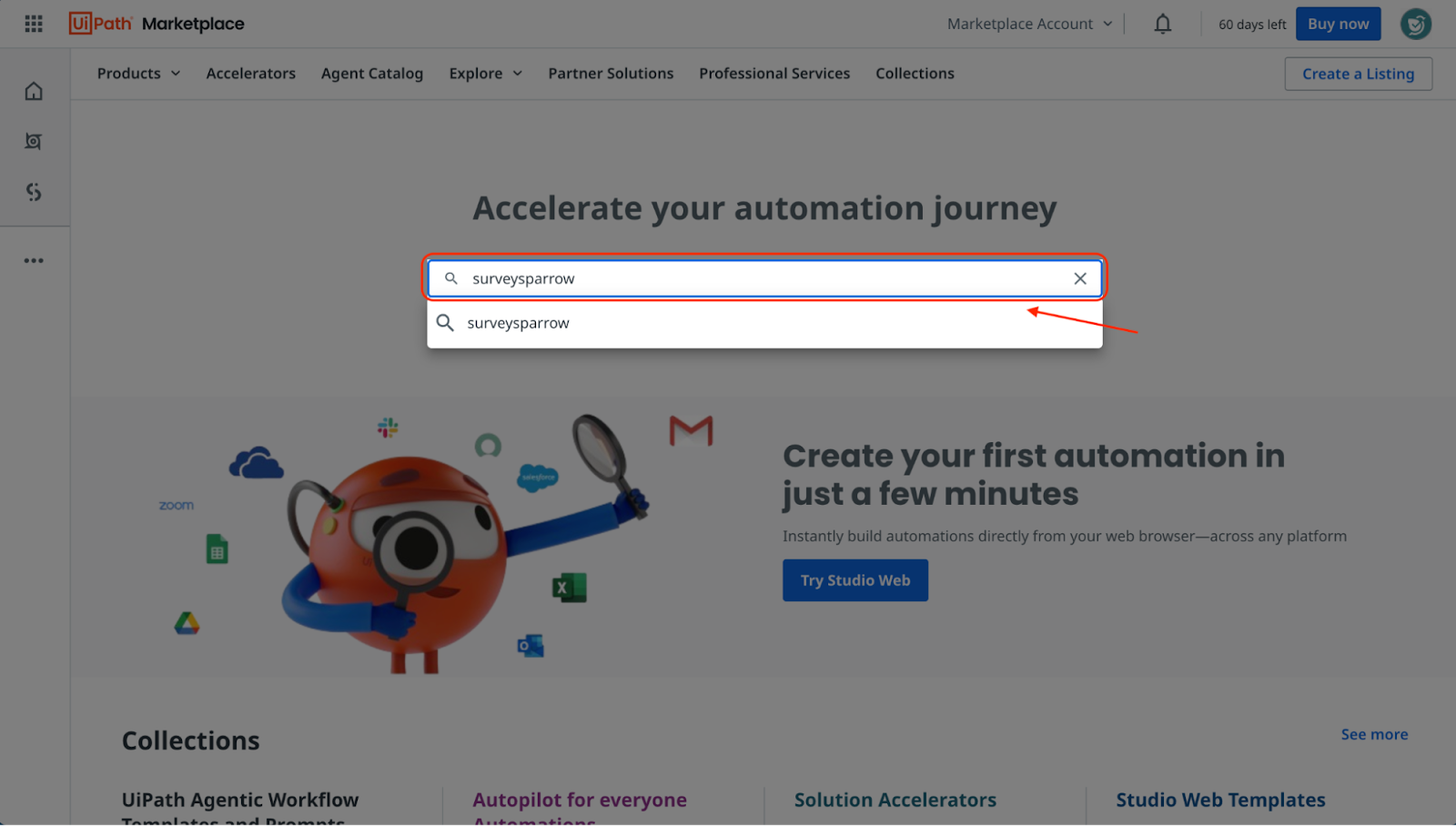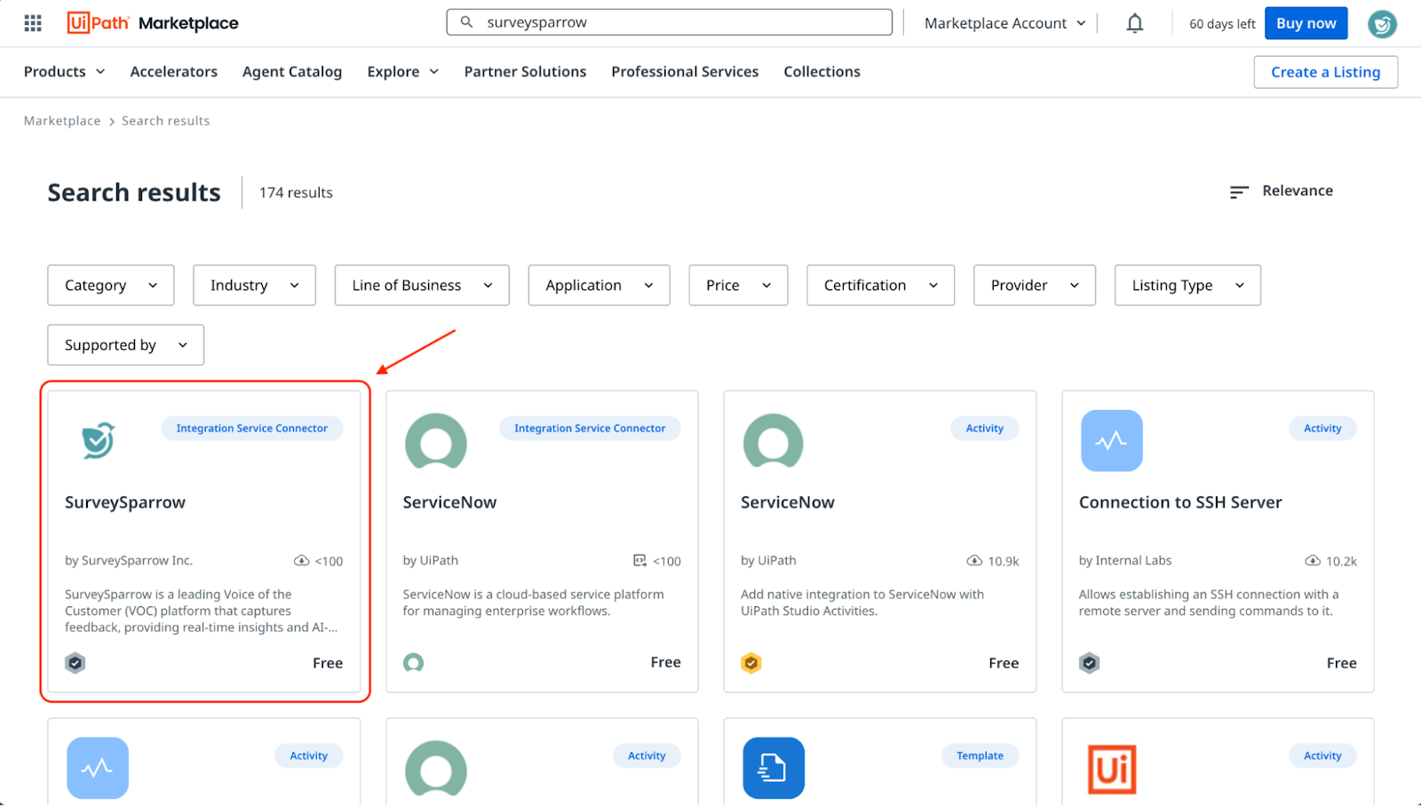 - When you enter the marketplace, use the search box to find the SurveySparrow connector.
