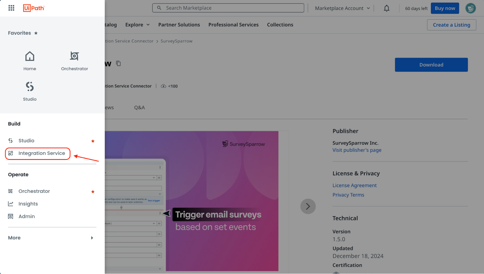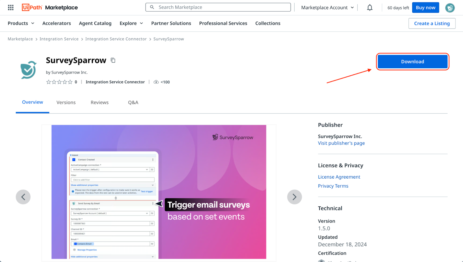 - When the SurveySparrow page opens, click on Download. The connector’s file package will appear in your computer’s Downloads folder.