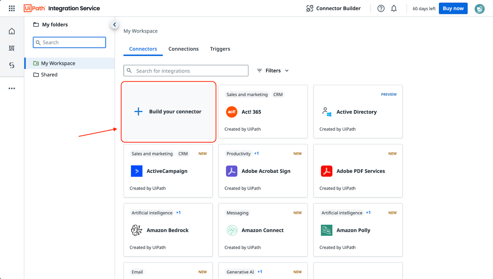 - Once the My Workspace page opens, click on Build your connector.