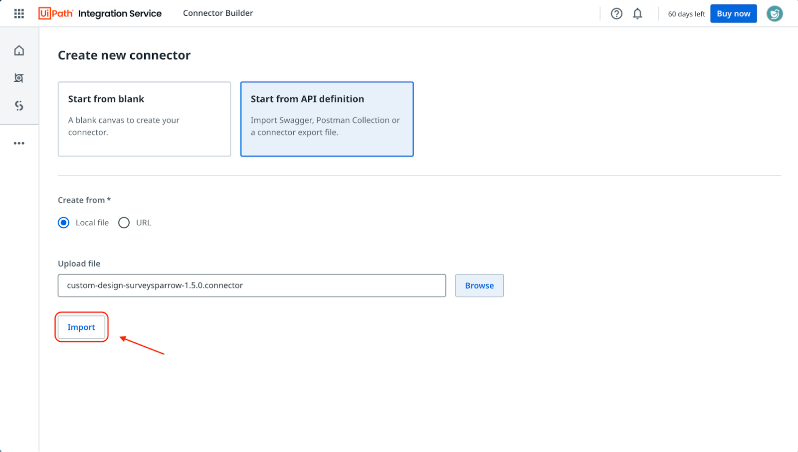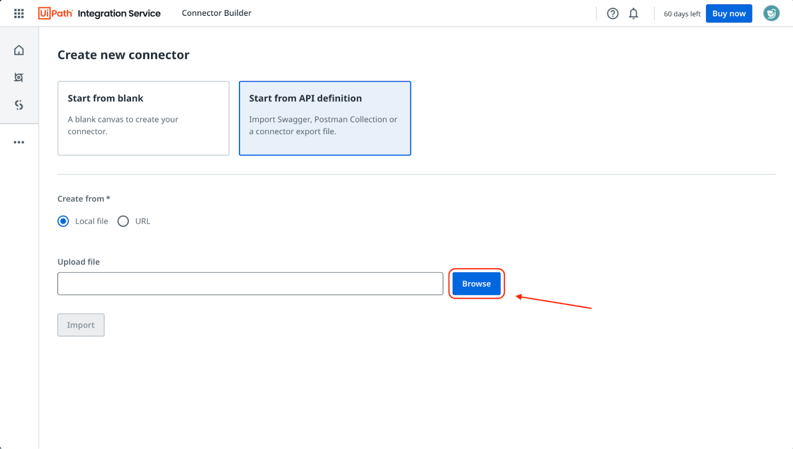- Here, we will have to upload the connector file package that we downloaded earlier. Click on Browse.
