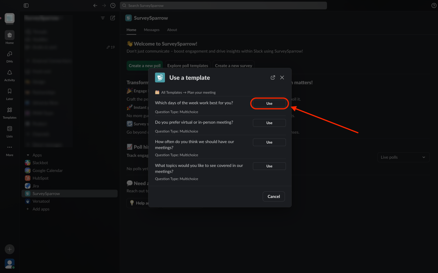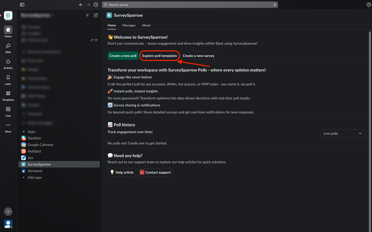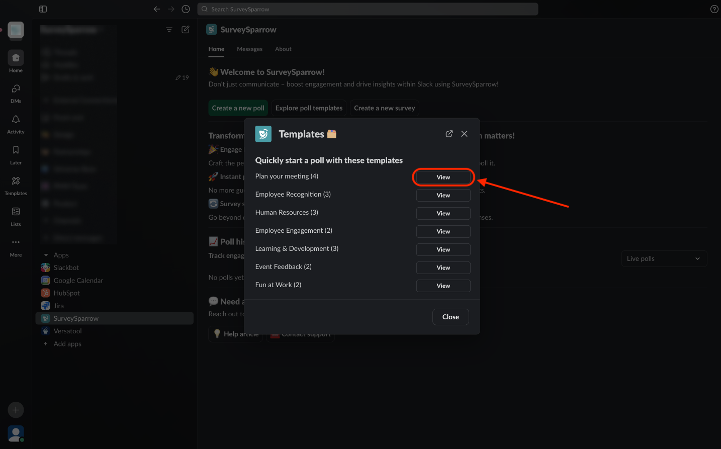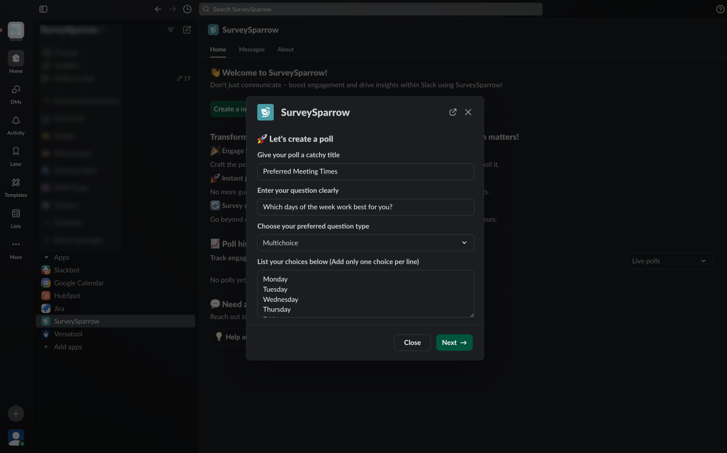 The SurveySparrow polls app for Slack makes it easy for teams to collect real-time feedback within the comfort of their messages. The app allows users to create, customize, schedule, and send polls to channels and individuals. To learn how to use the app, click here.