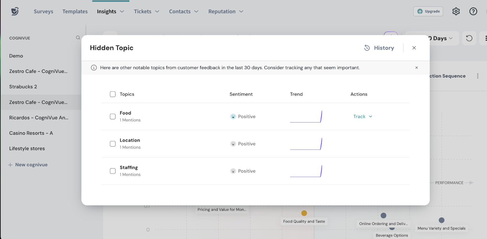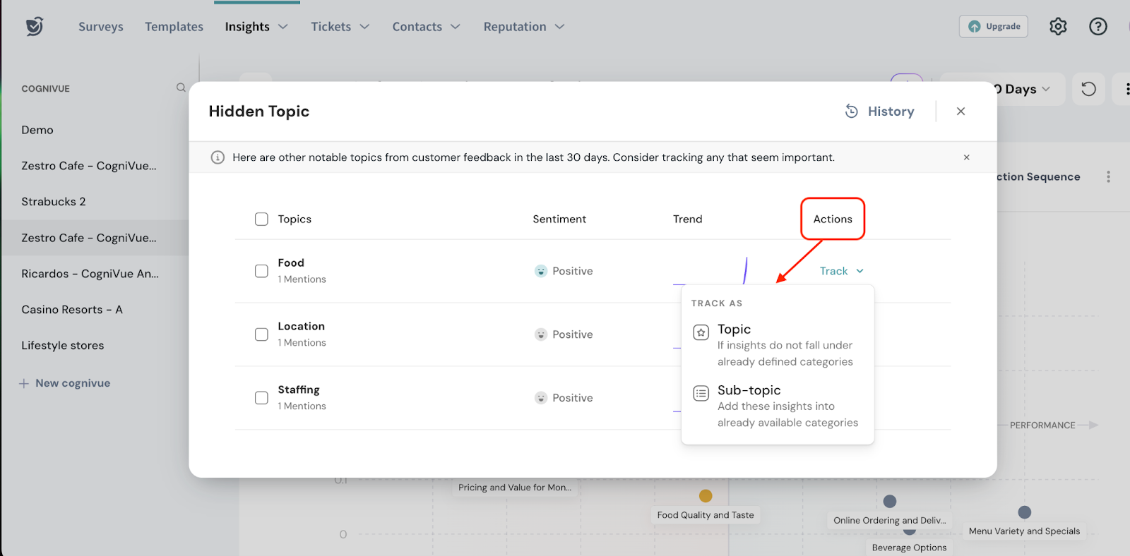 - You will get the pop up containing topics, sentiment, trend and actions.