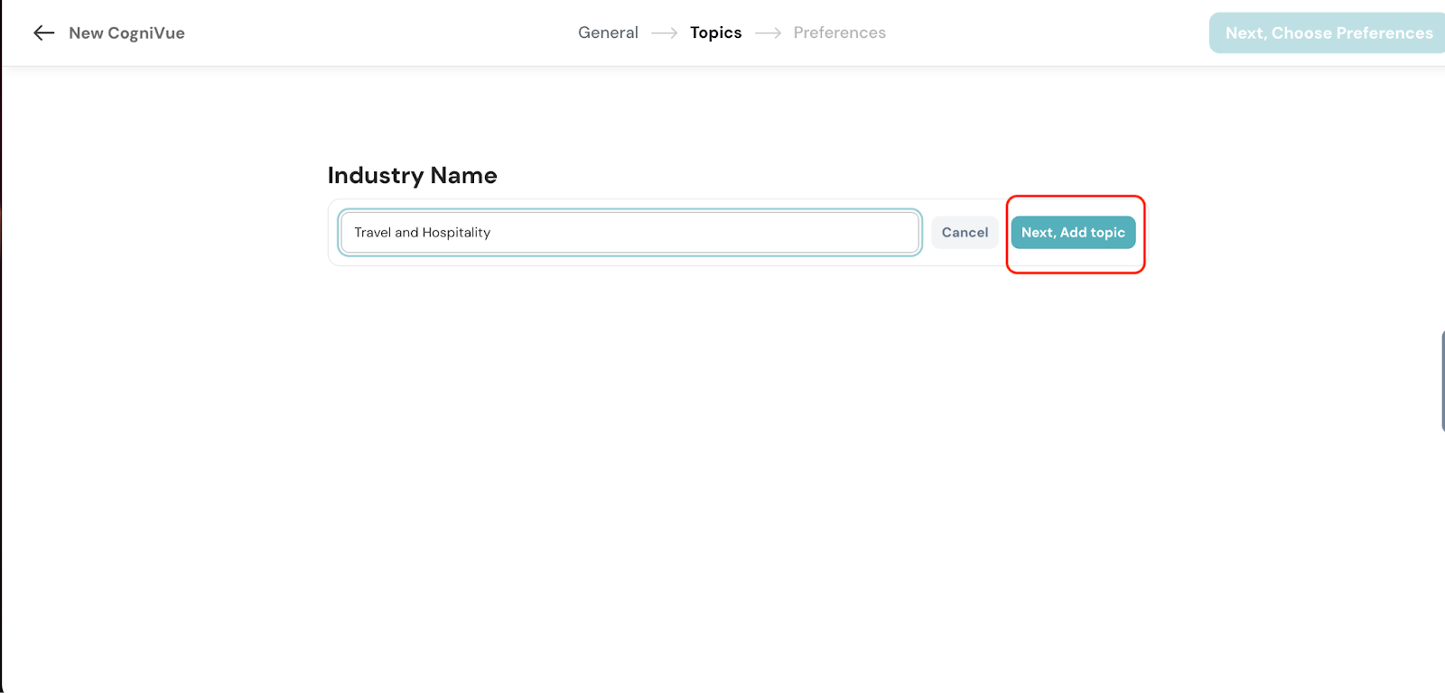 - You can add a new industry and click on ‘Next, Add Topic’ to proceed.