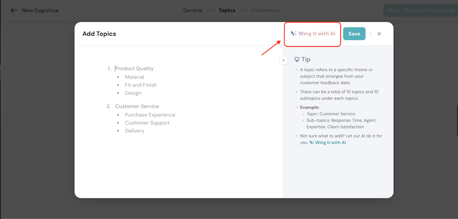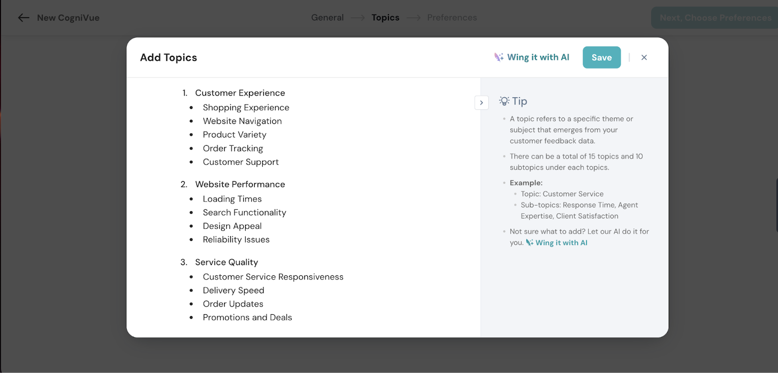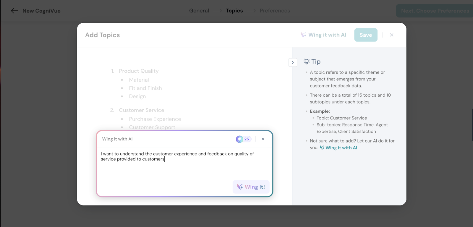 Topic Generation with Wing AI generates topics and subtopics based on prompts. This makes it easier to categorize feedback and identify key themes.