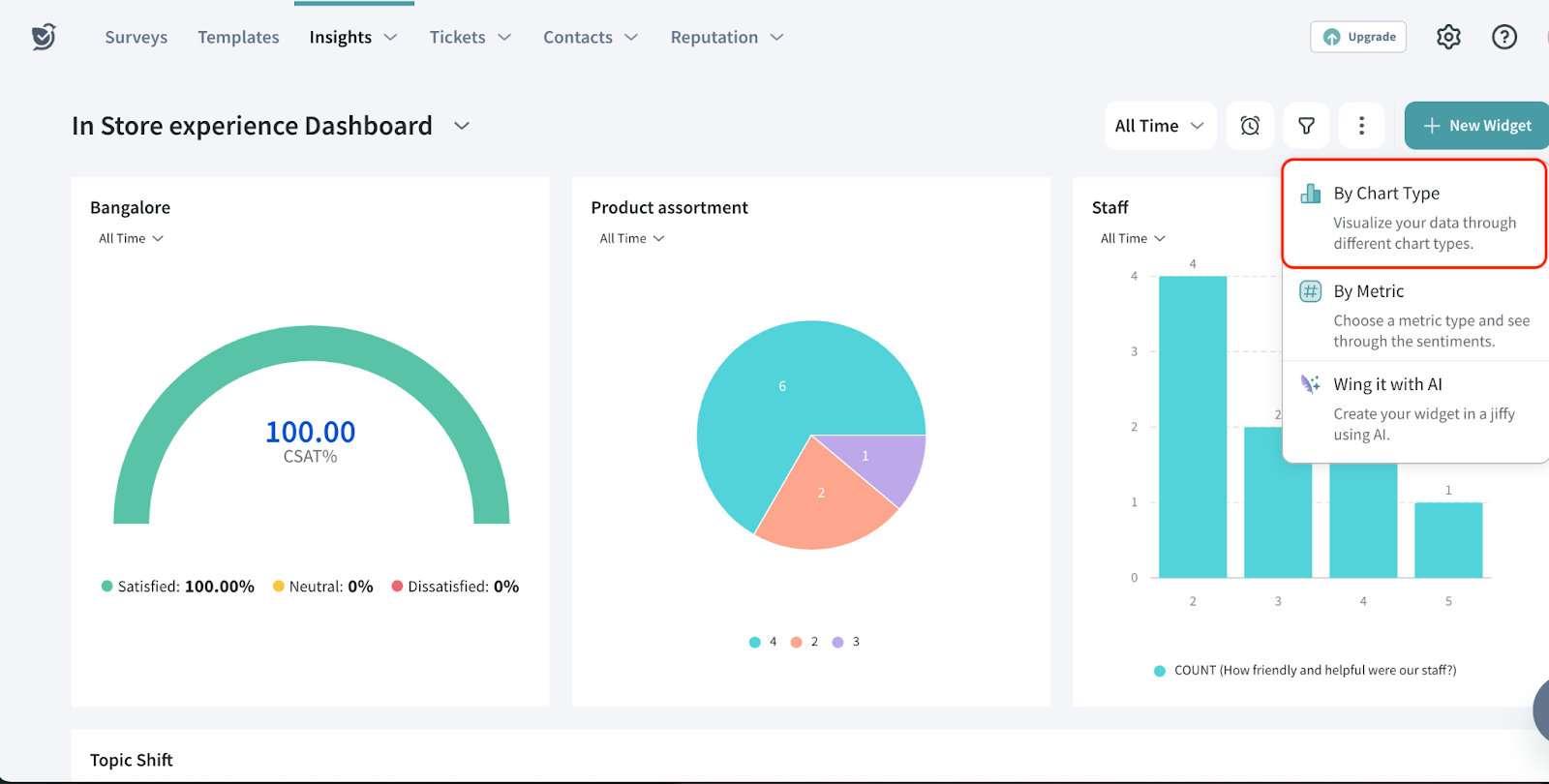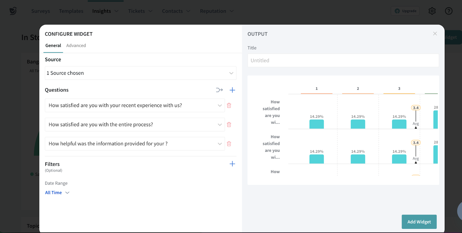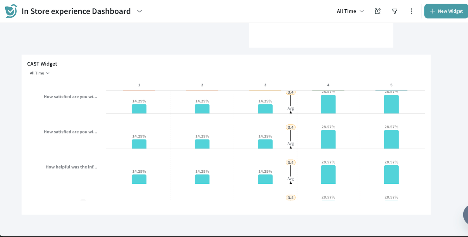The Rating Widget allows you to effortlessly visualize the performance and distribution of multiple Likert scale questions in a single widget. With this widget, you can track and compare multiple aspects of your business or product at a glance, gaining valuable insights without the need for complex data analysis.
