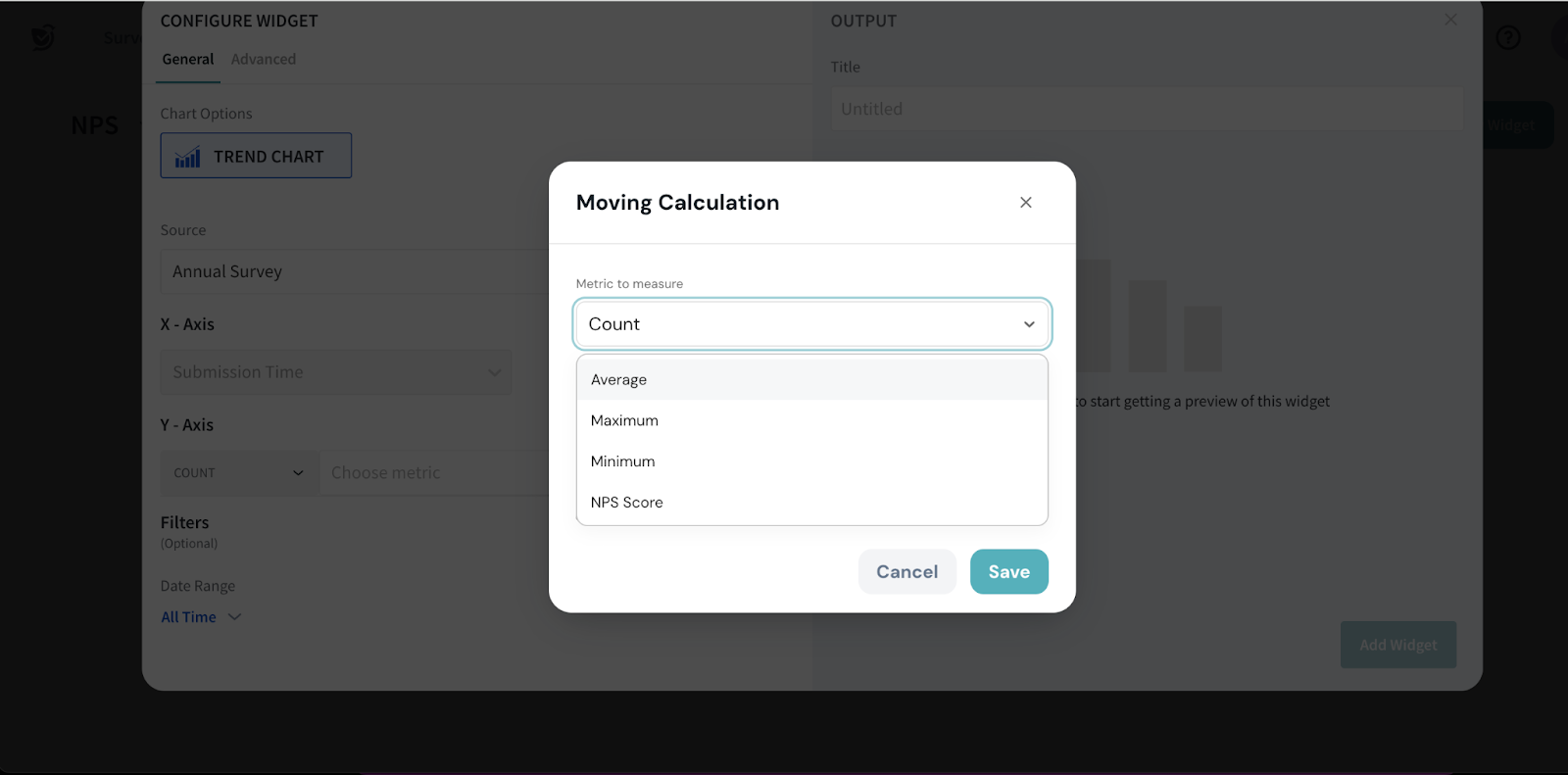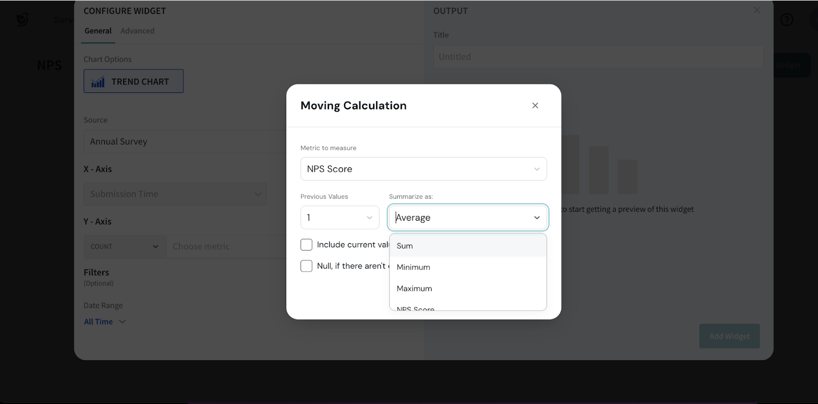 For example, if you set a previous value of 3, the system will calculate the average score from the past 3 months. This can be set to months, quarters, or days, depending on the range defined in the widget.