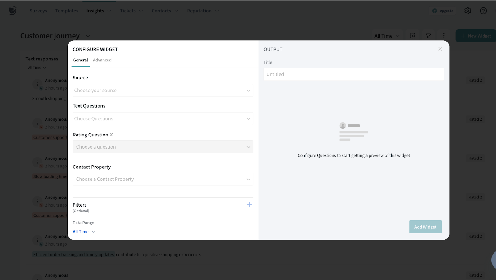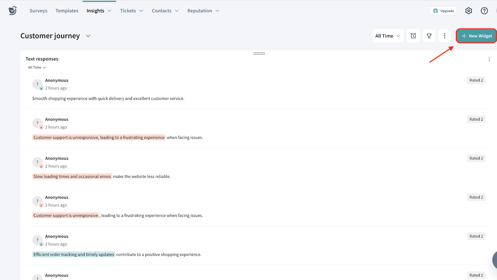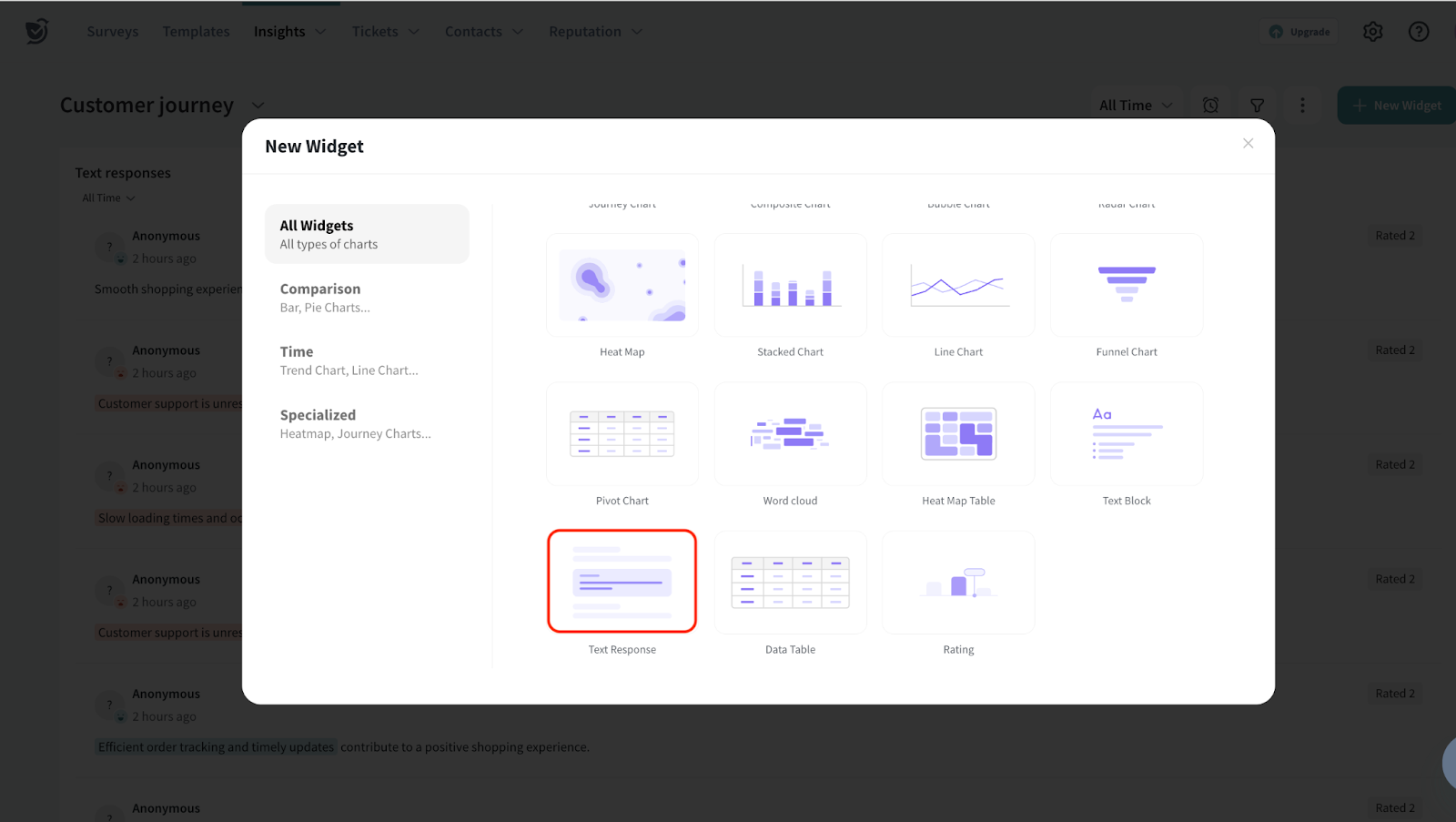 The Text Widget allows you to view and analyze individual text-based responses for single or multi-text questions. You can see all customer text feedback in one widget, making it easier to review responses and track sentiment.