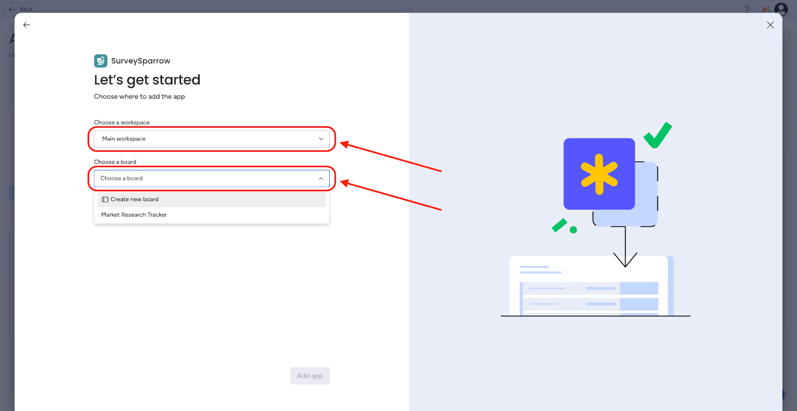 7. Now select the workspace and the board where you would like to choose the app. Click on the drop-down menu to choose from the existing options.