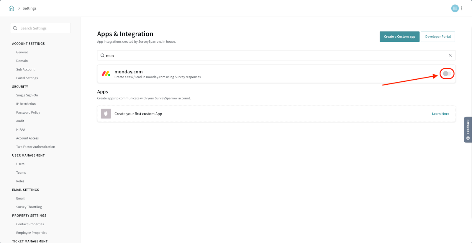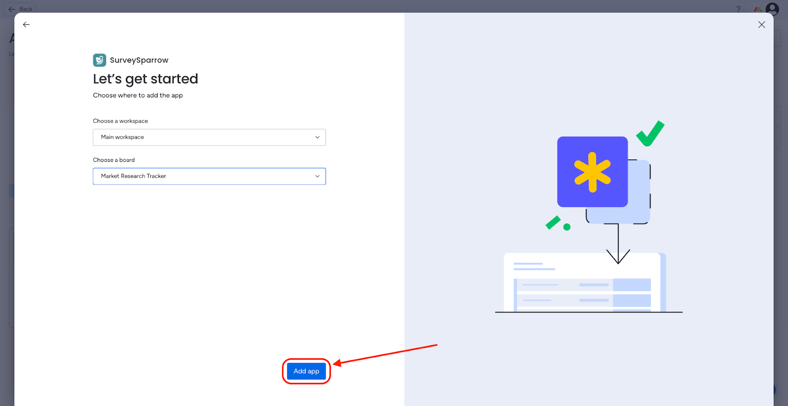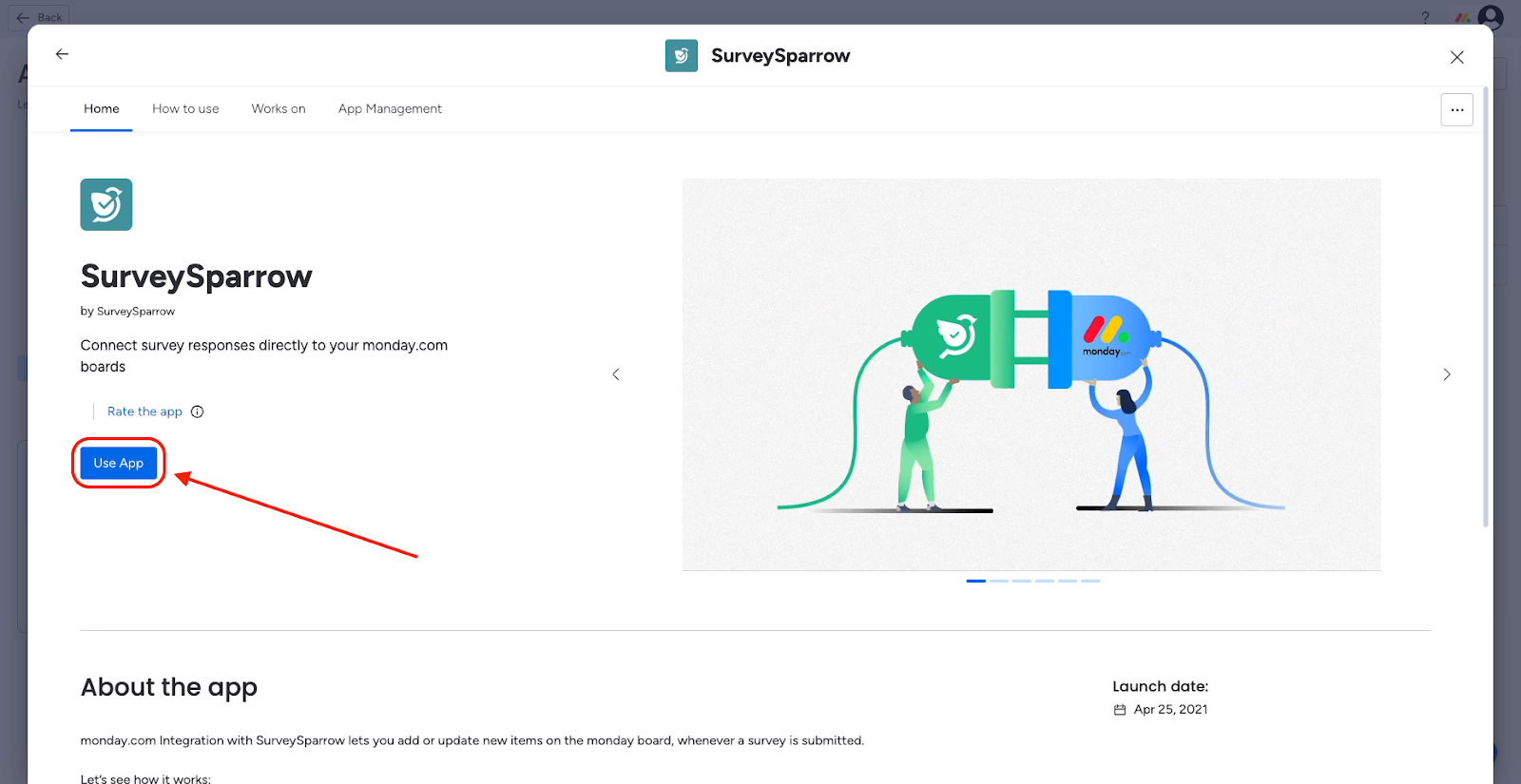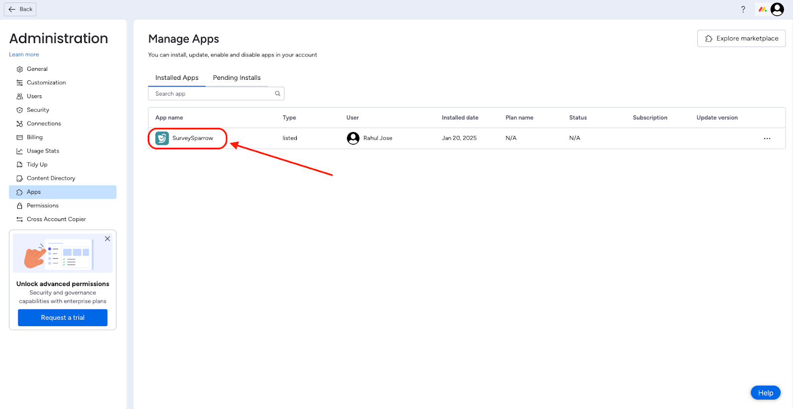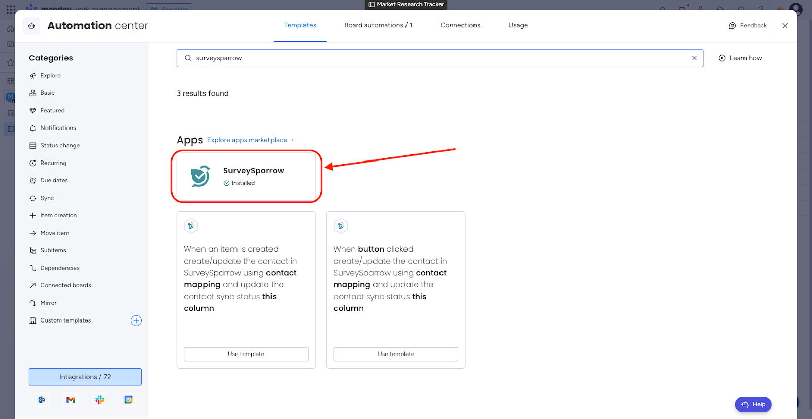 5. Now you’re in the monday.com app, where you’ll see SurveySparrow among the installed apps. Click on it.