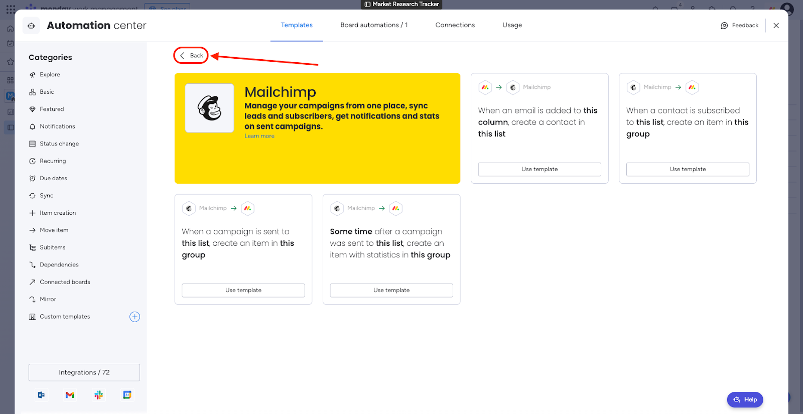 3. Type in the search box (or scroll down the integration list), then click on the toggle when the monday.com integration appears.