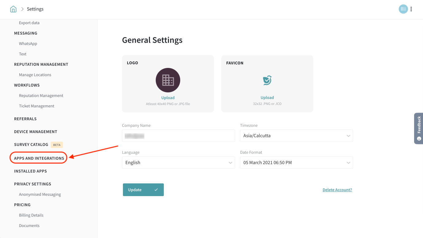 2. Scroll down the left panel, till you see Apps and Integrations, then click on it.