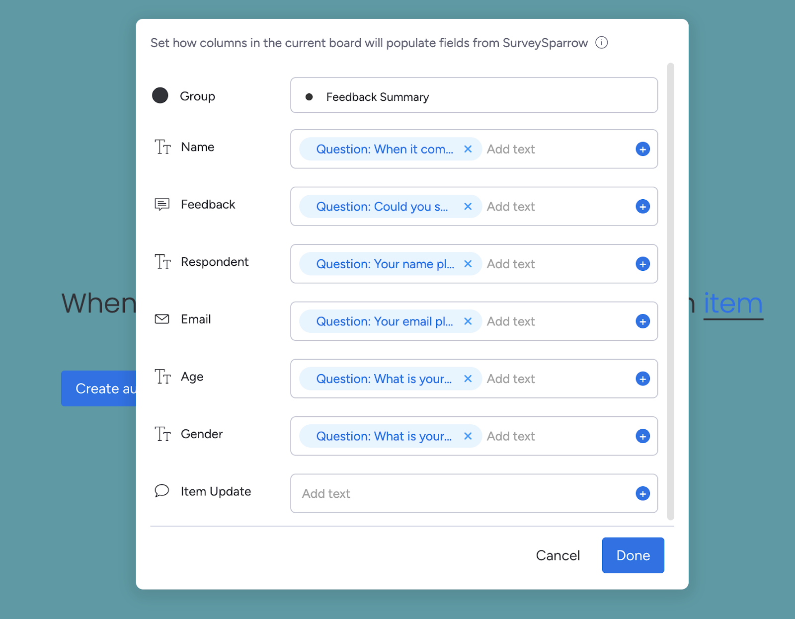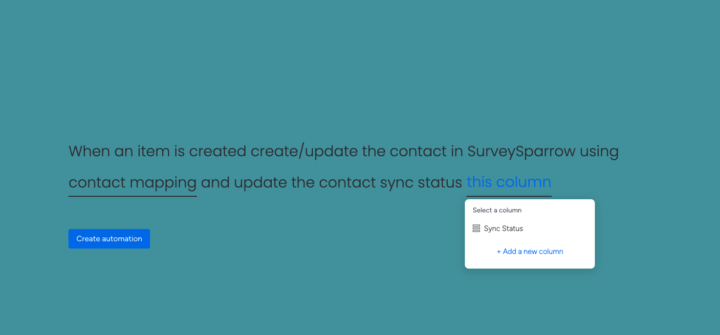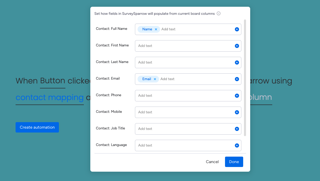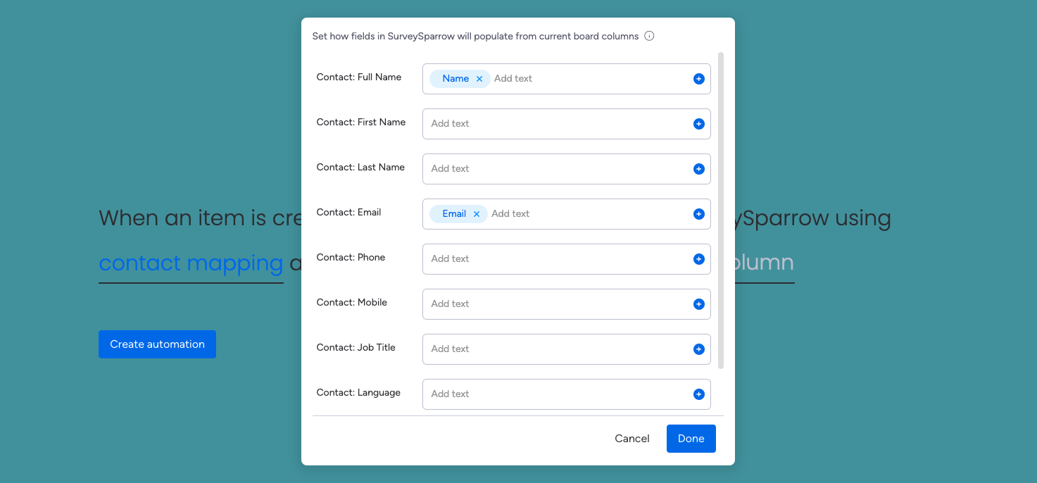 1. The first part is the contact mapping. Here you will have to decide which columns from the board will populate the different contact fields inside SurveySparrow. You can also add text in the fields.