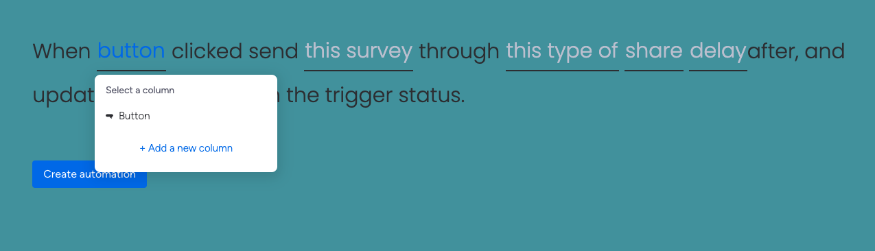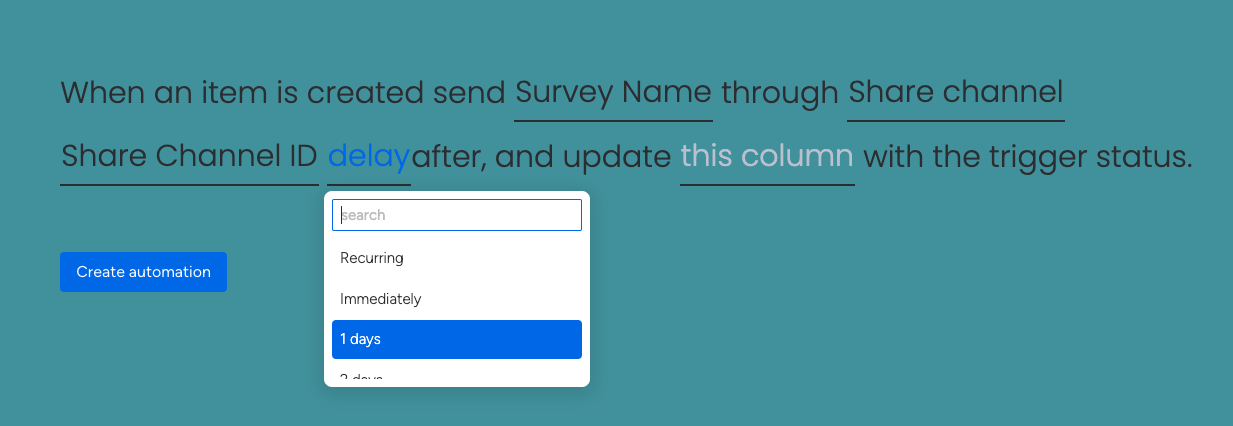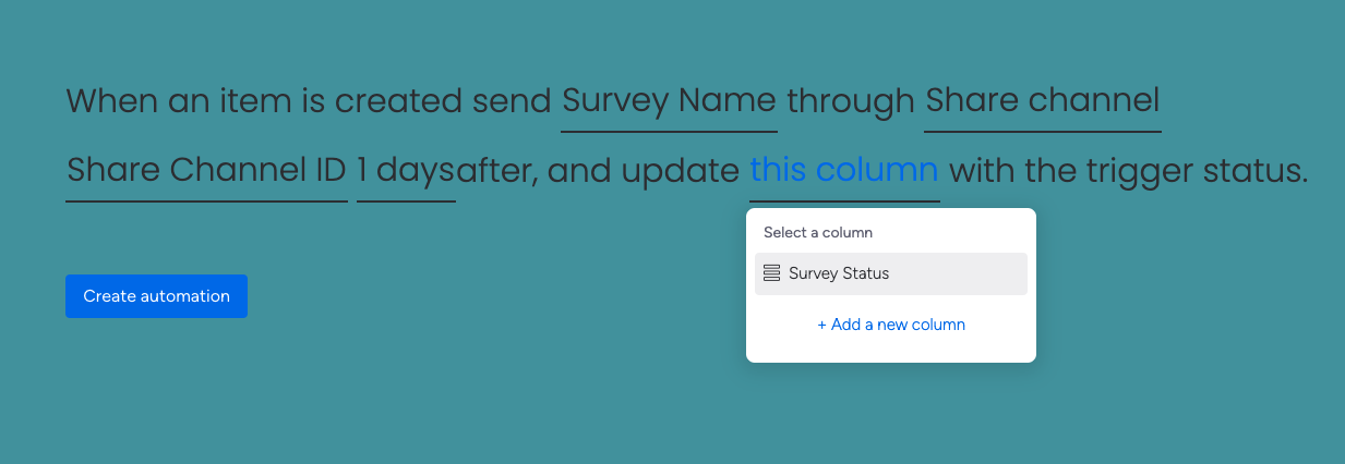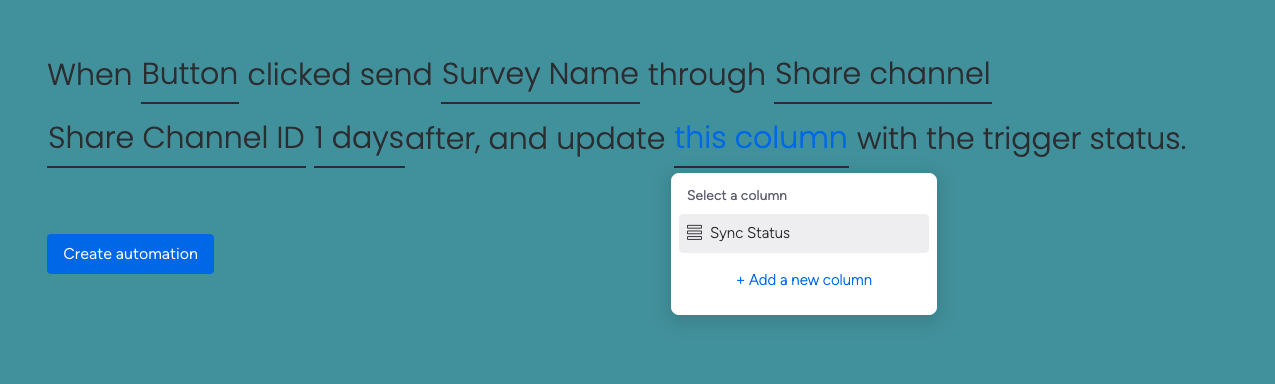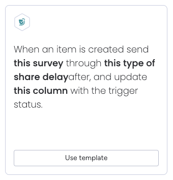 In previous recipes, the survey deployment is instant for a new item or status/value change. This recipe requires you to manually deploy surveys, with the click of a button.This offers you flexibility and control. You can also configure the exact share channel and share ID for each item, giving you even more flexibility. Plus you’ll also get to see the status of the survey deployment, so that you can catch failed deployments.