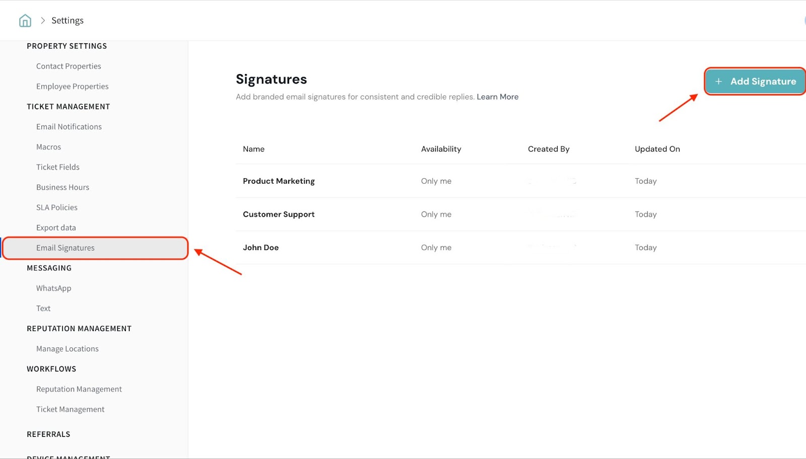 2. Go to Email Signatures under Ticket Management and click on ‘Add Signature’.