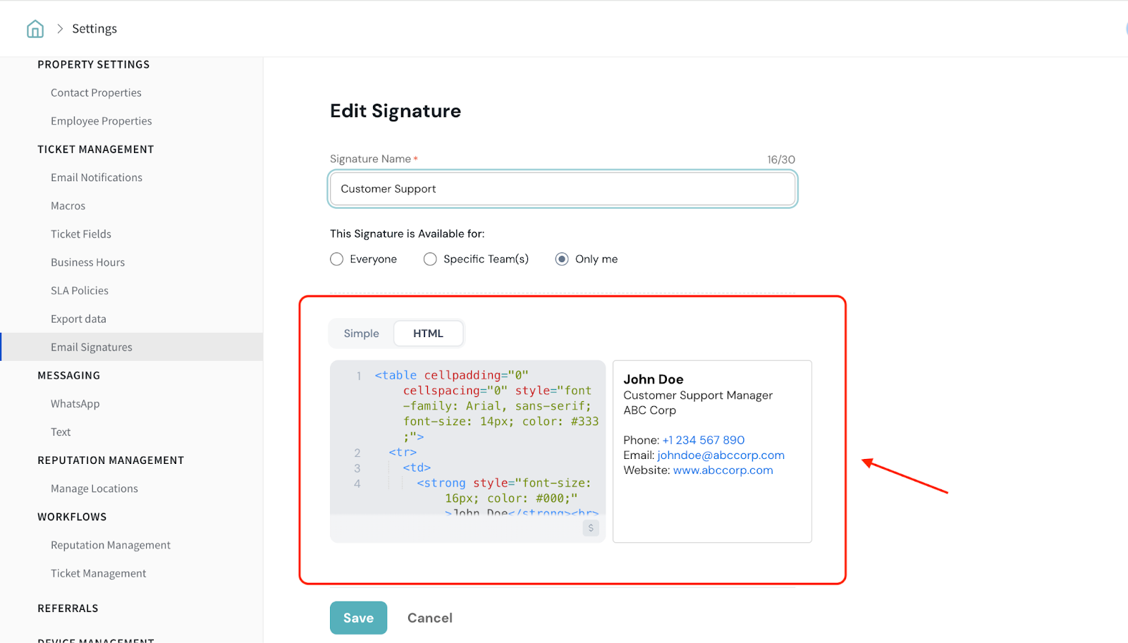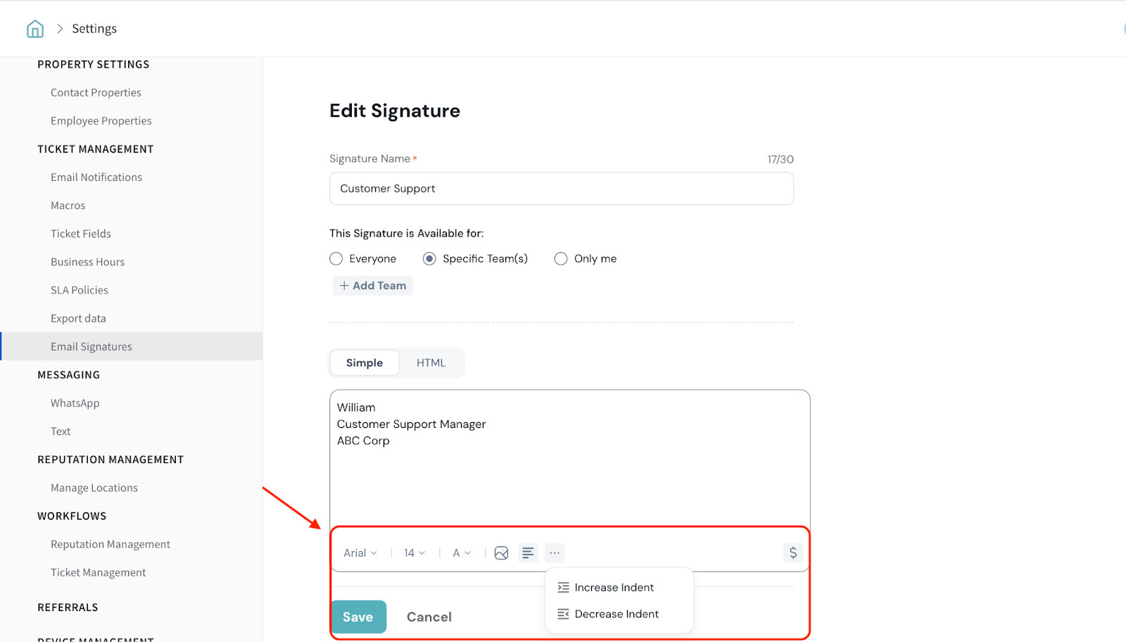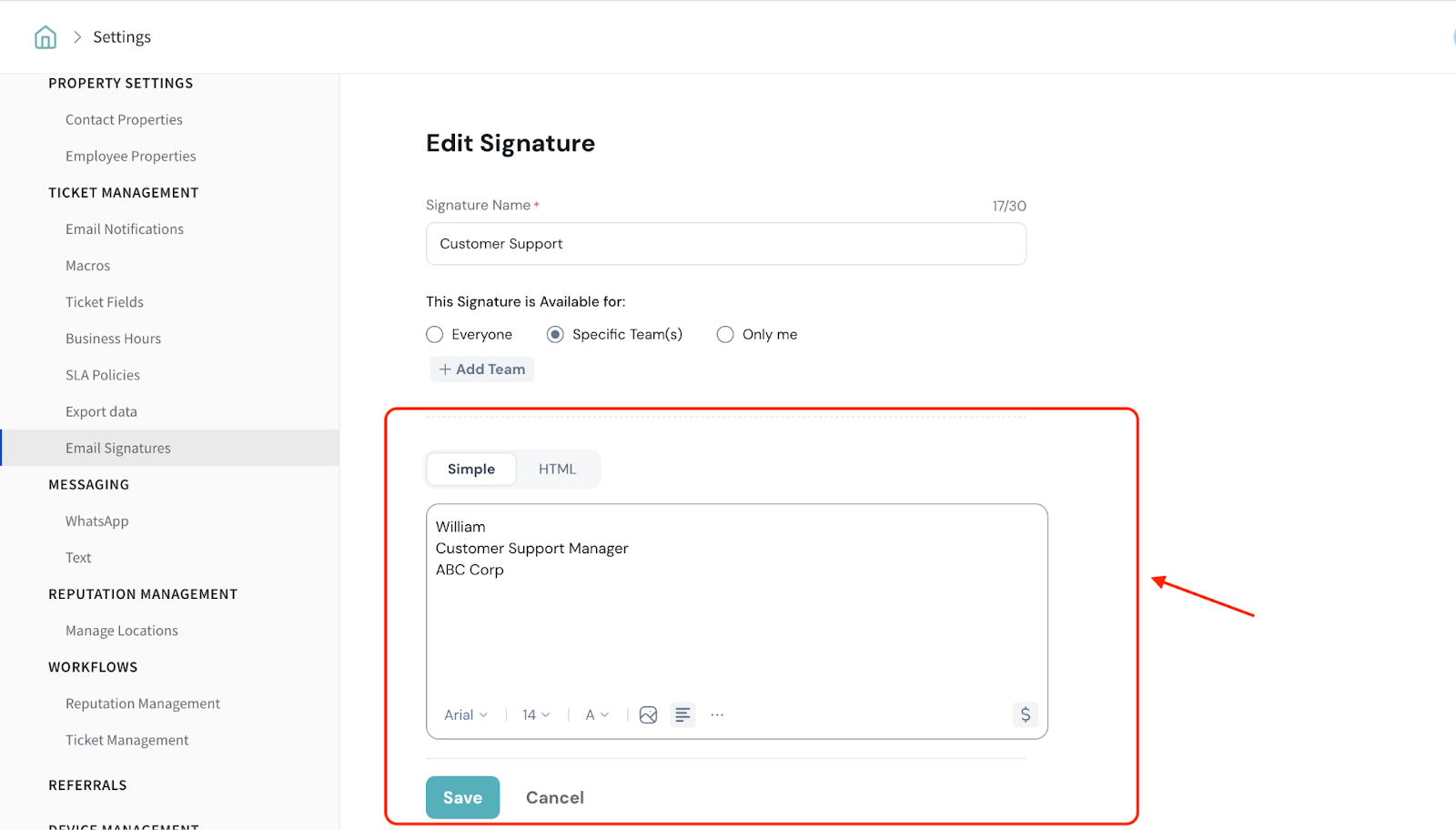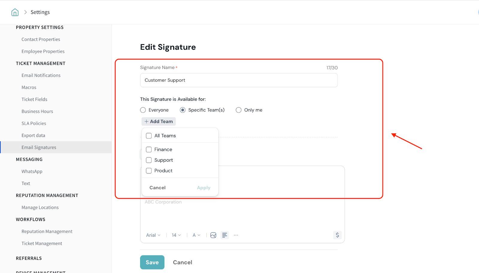 - Specific Ticket Teams: Limit access to selected teams. For example, you might want only the Support team to use this signature.