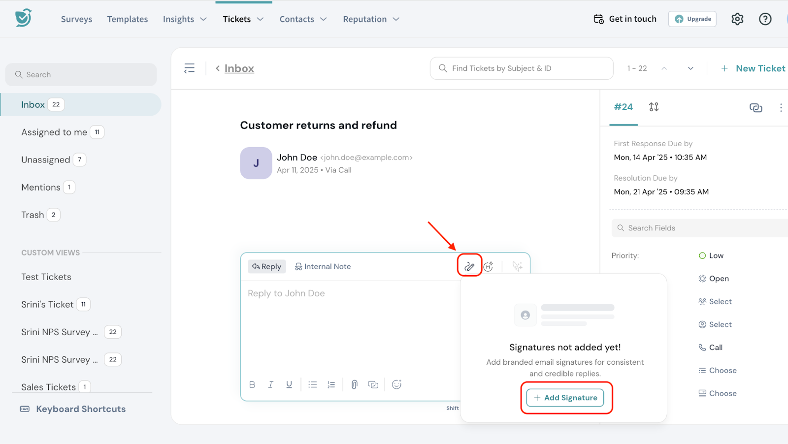 Note: You can also access Email Signature settings directly from a ticket. If you're creating a signature for the first time, click on