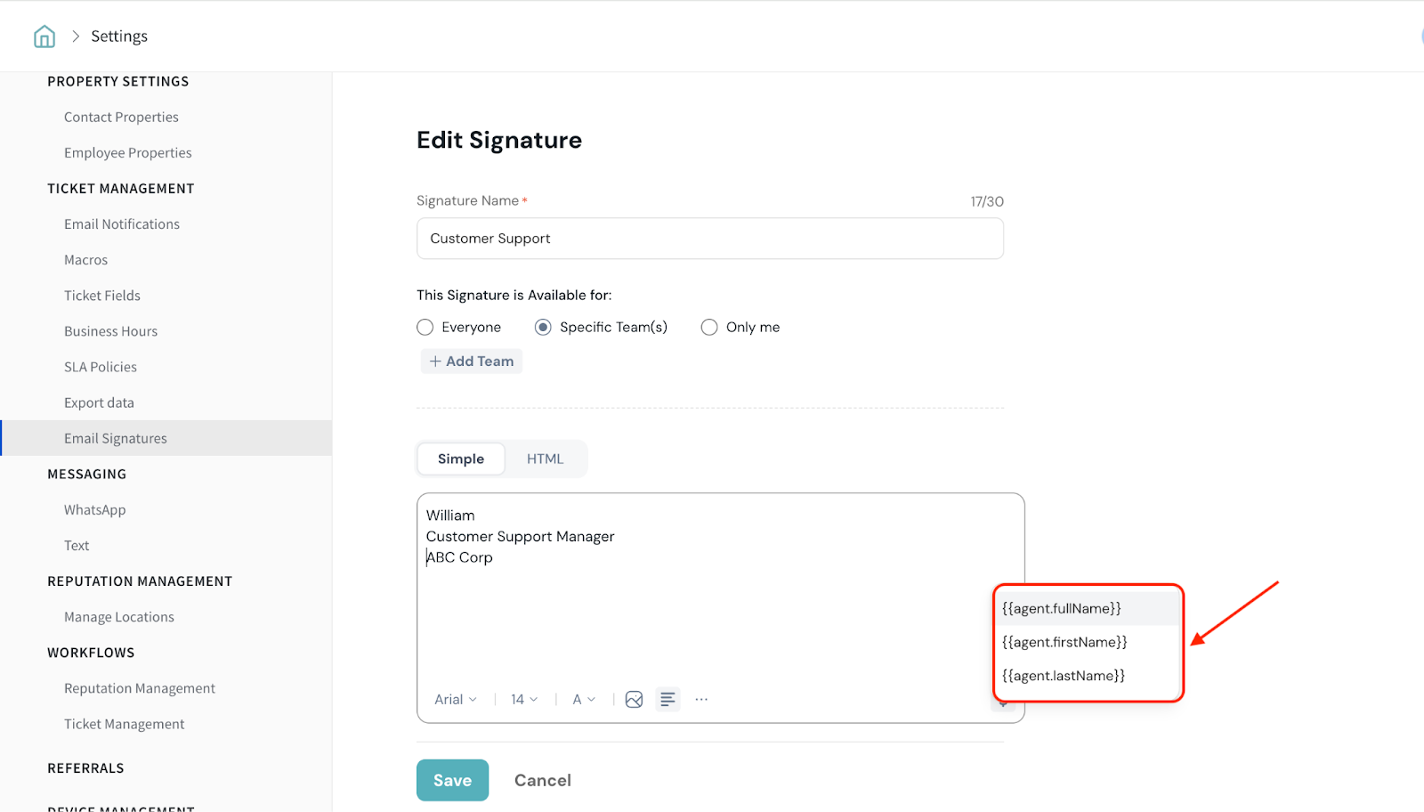 With the $ icon, you can use placeholders to automatically insert agent information into each message. These dynamic fields ensure that each agent's signature is personalized without requiring manual edits.