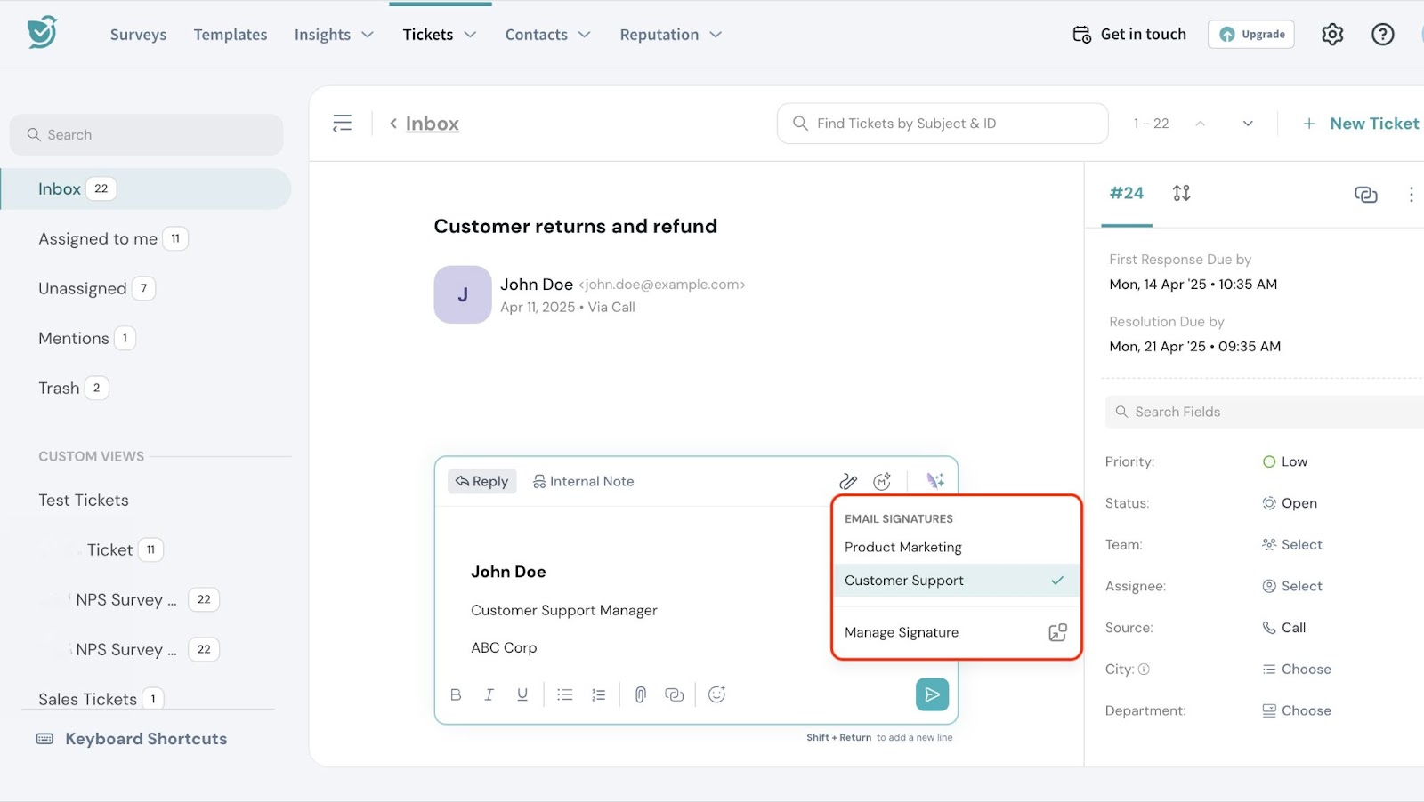 In CX ticketing workflows, email signatures help create a consistent and professional appearance across all customer communications irrespective of which team agent sends the message.