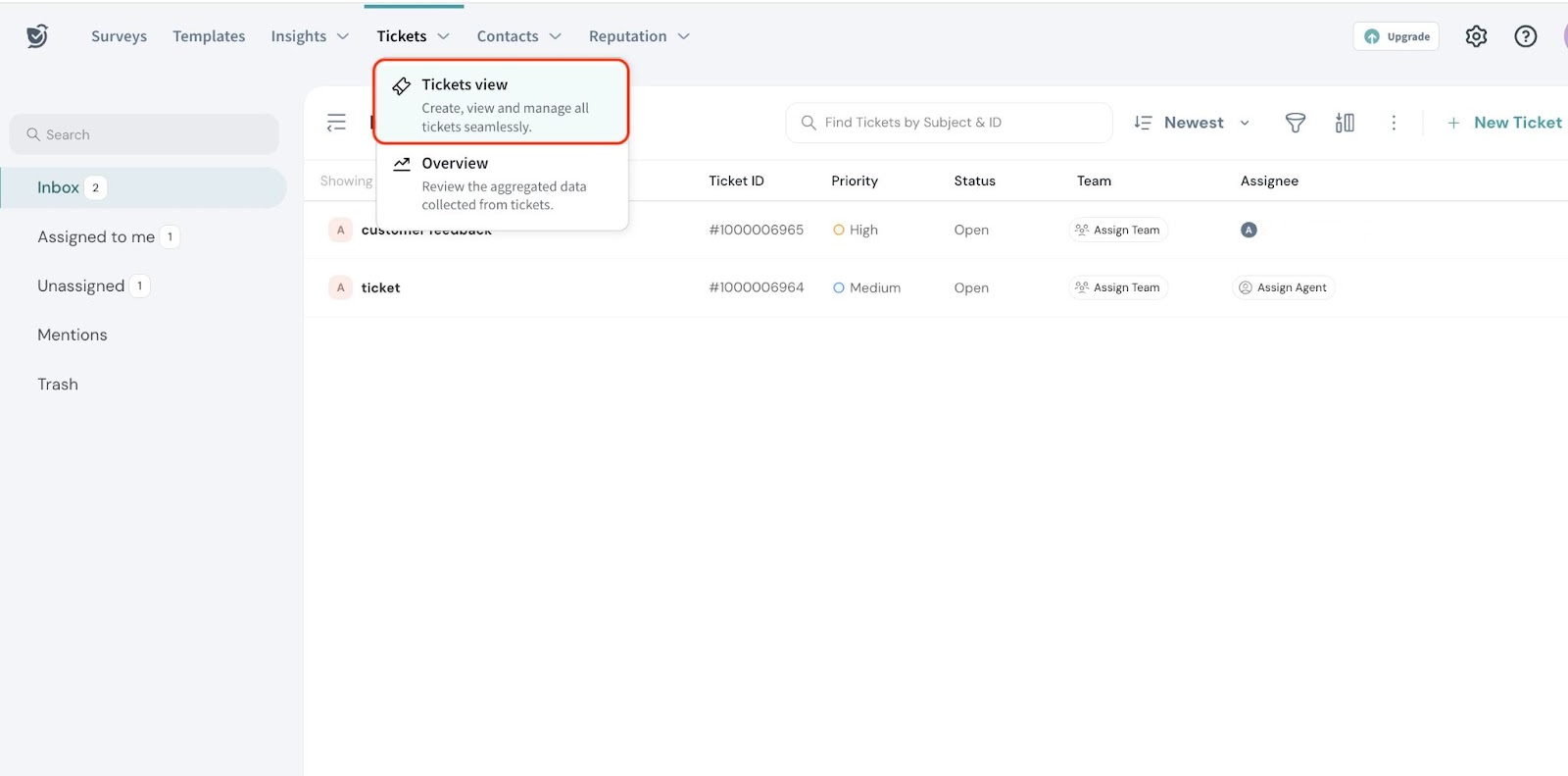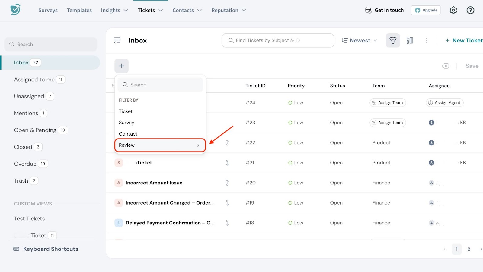 You can filter tickets tied to customer reviews, making it easier to track sentiment, improve response times, and manage reputation.