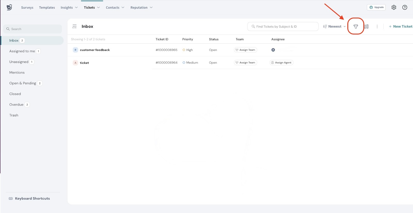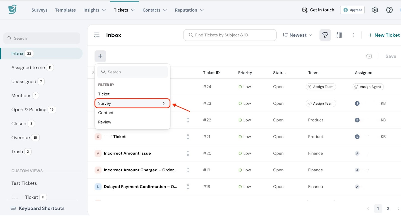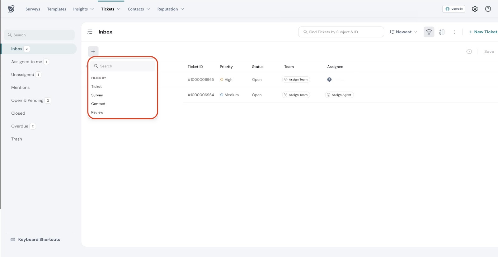 - You’ll see filter options grouped under Ticket, Survey, Contact, and Review—just like in the ticket view.