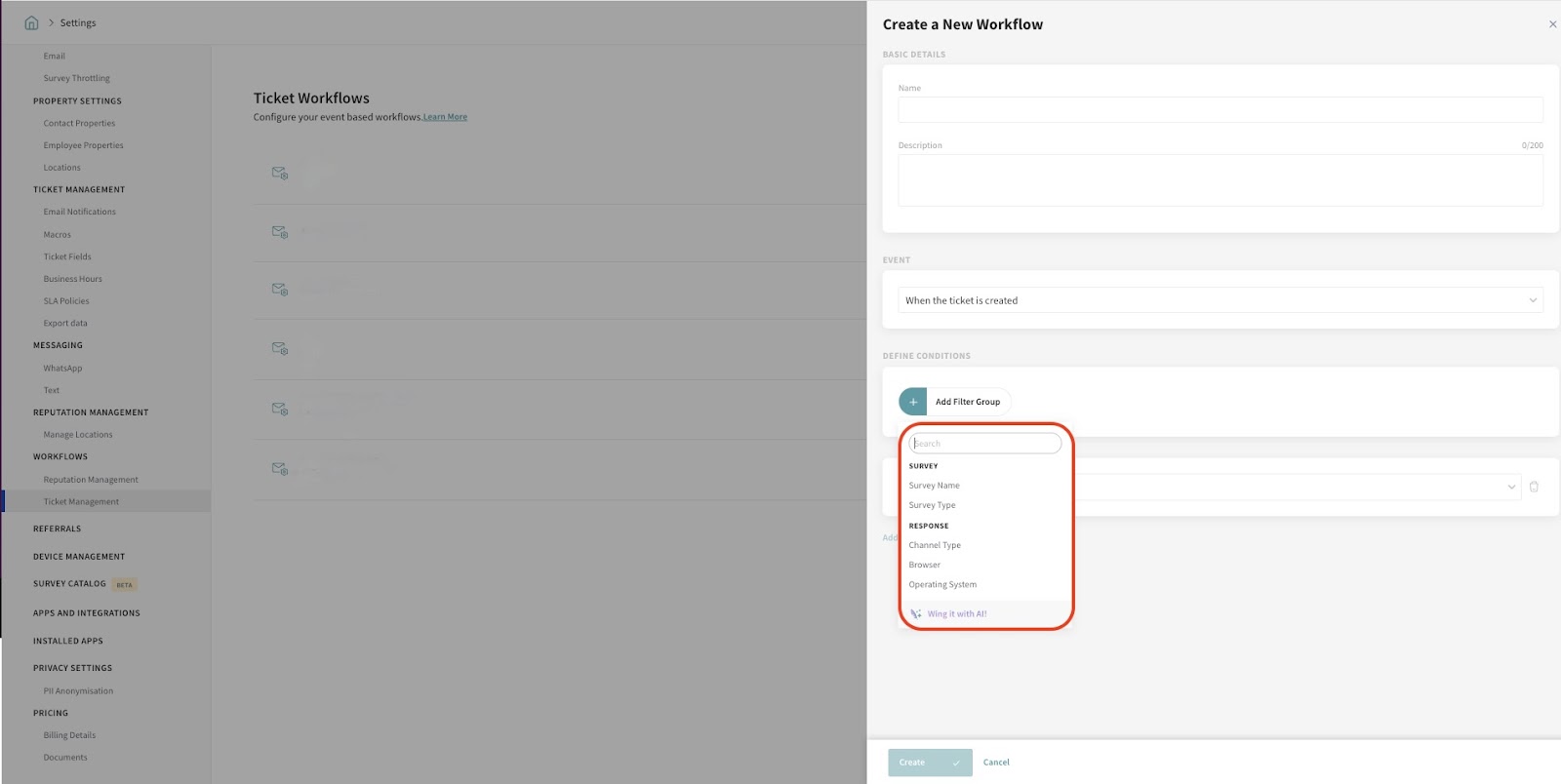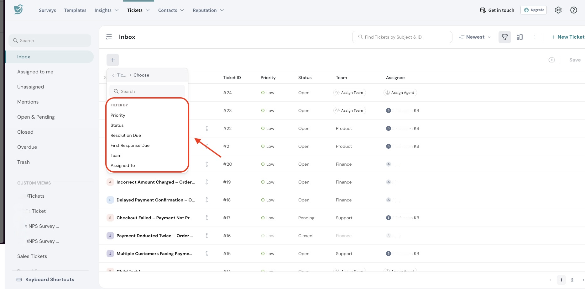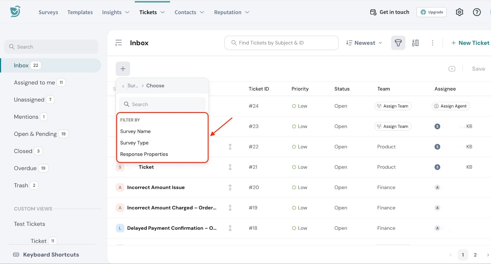 Filters help define specific conditions when setting up ticket workflows. You can use filters based on survey responses, reviews, contact details, and more to automatically assign, escalate, or route tickets. This ensures that important issues are handled promptly and by the right teams.