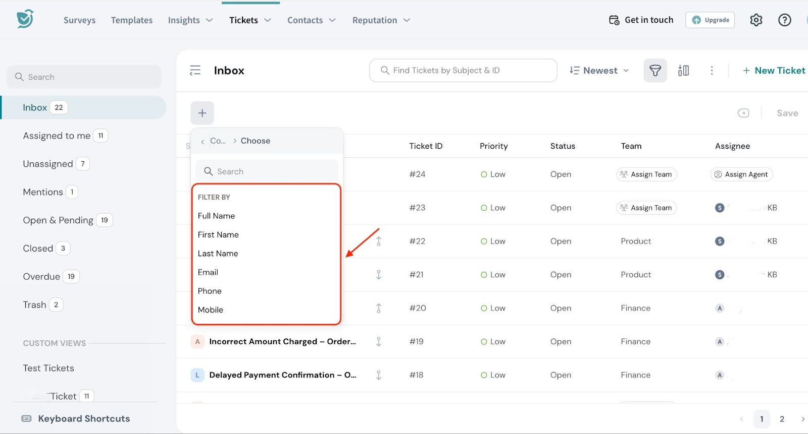 Example: In our case, filter by Full Name to find the ticket from the customer who reported receiving a defective product. This ensures their issue is addressed promptly and doesn't get overlooked in a large queue of tickets.