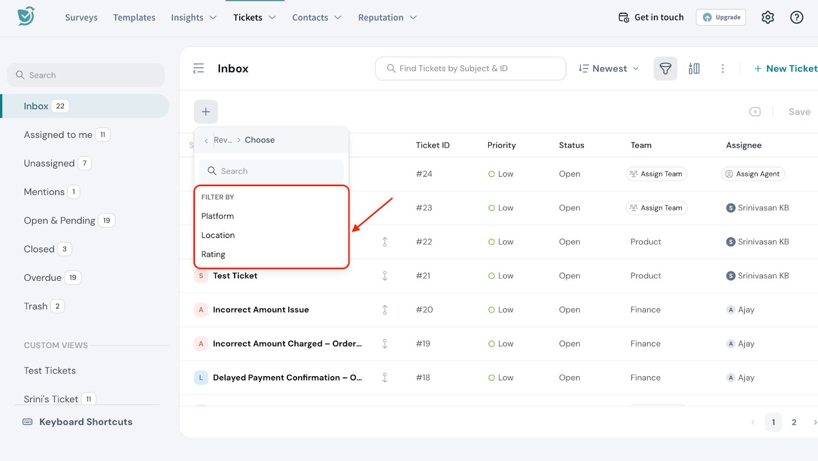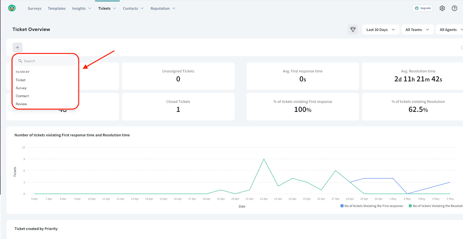 5. You will find options to filter tickets based on Survey type, Response type, Review type, Contact Type.