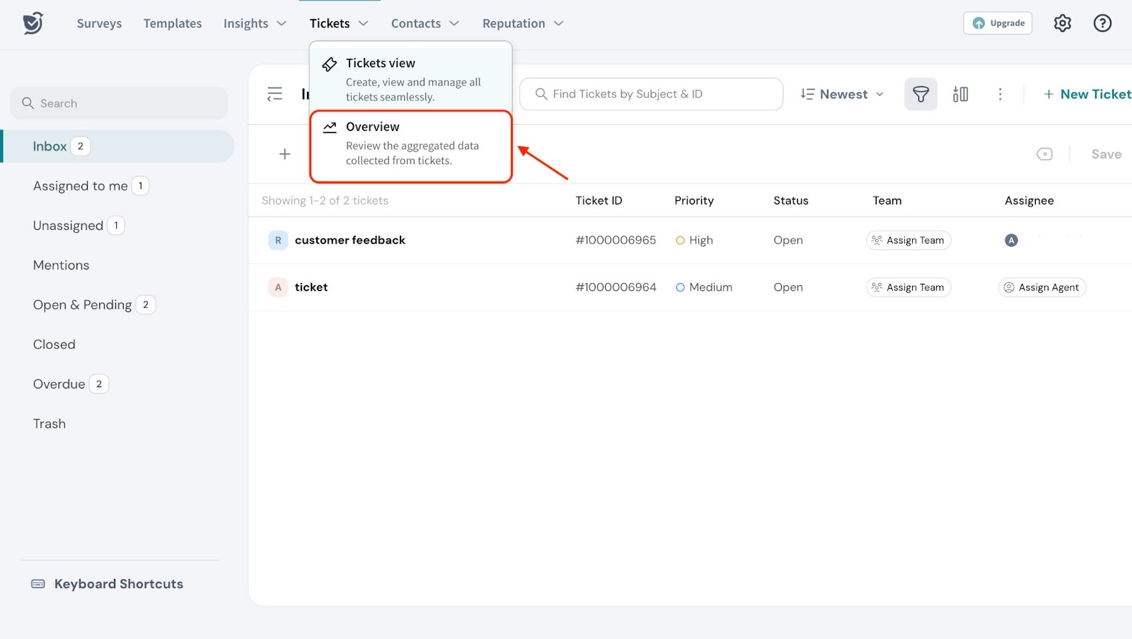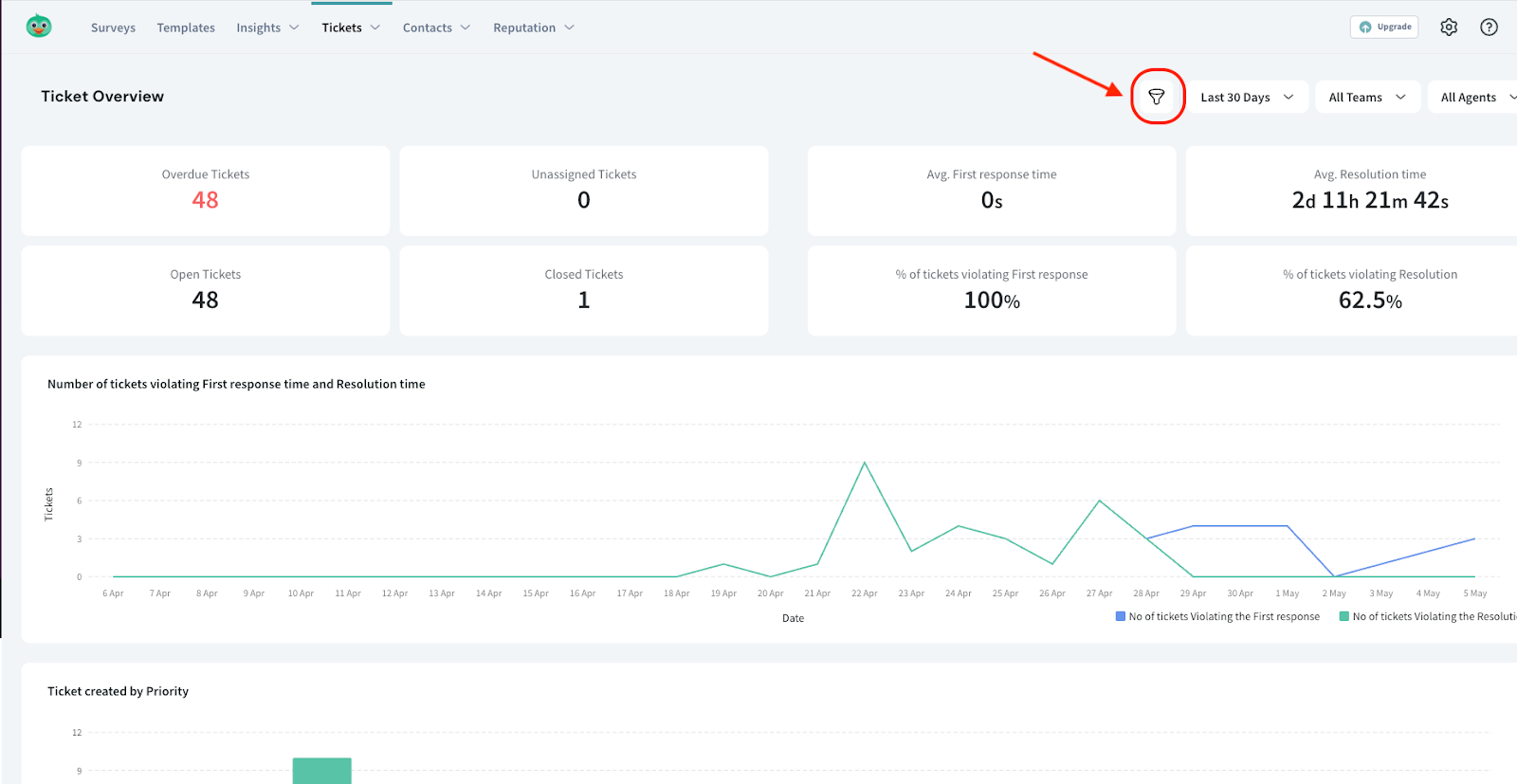 - Better dashboard insights: Managers can apply filters to tickets overview dashboard, creating more accurate and meaningful reports to track negative feedback trends and improve decision-making for proactive support.