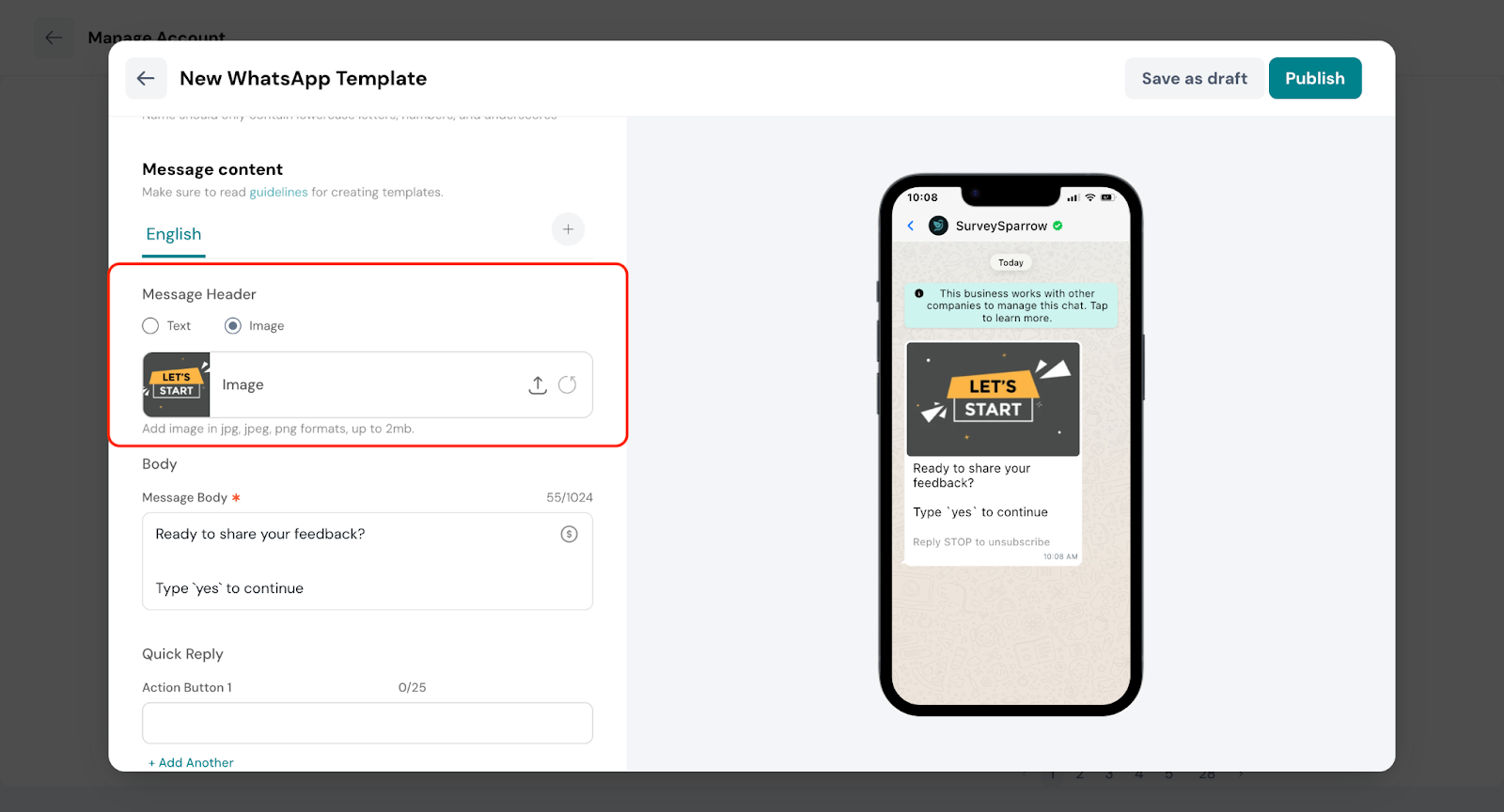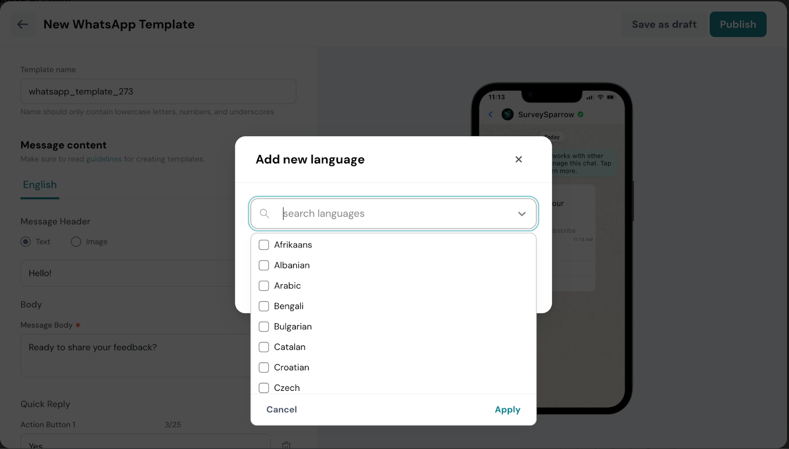 Note: As you build your WhatsApp template, you’ll see a live preview of the message on the right side.Note: You can also add variables (e.g., $name) using the $ symbol to personalize the header based on each recipient.