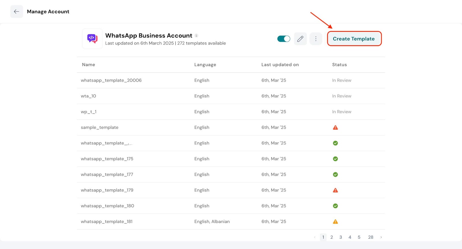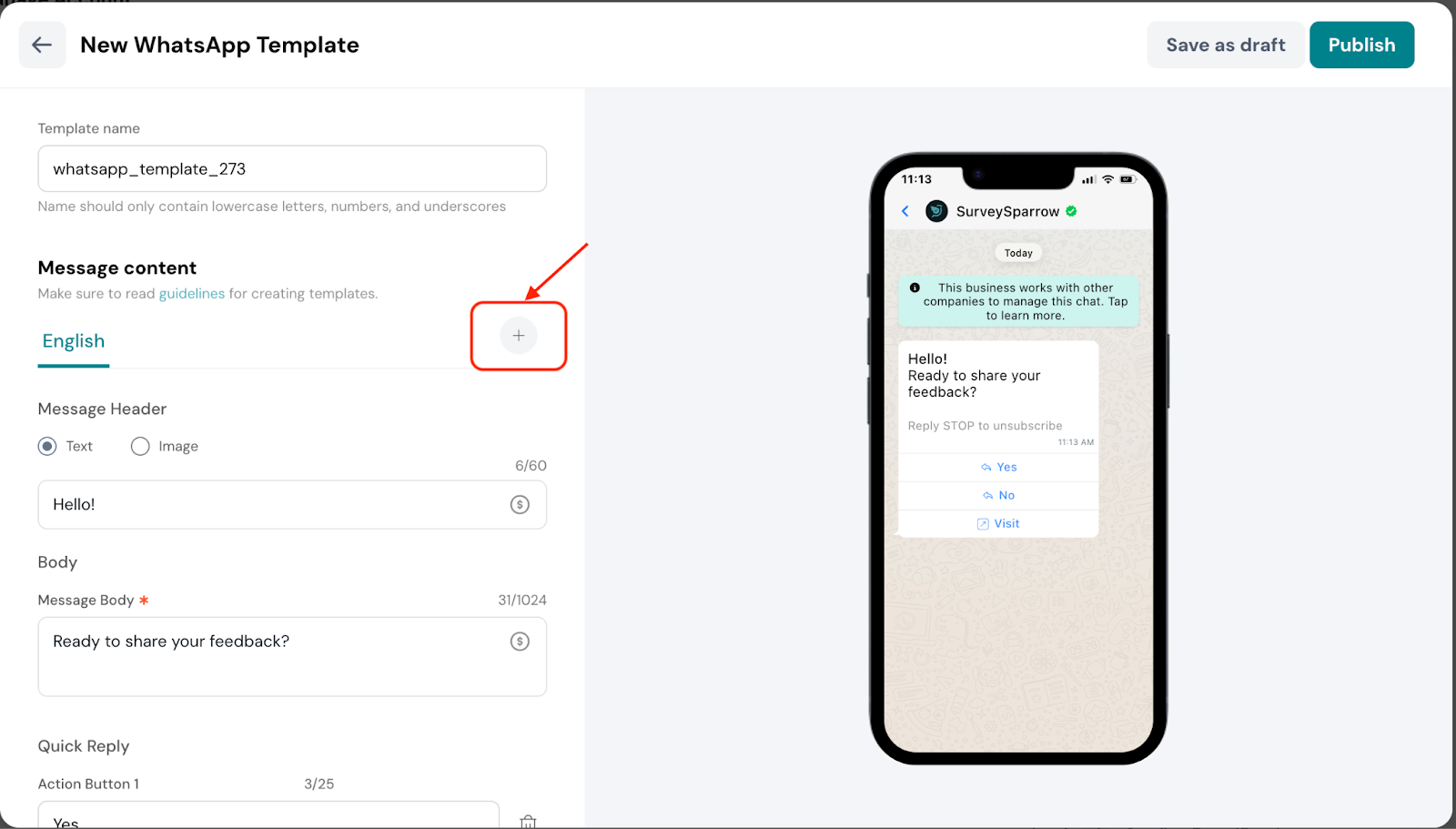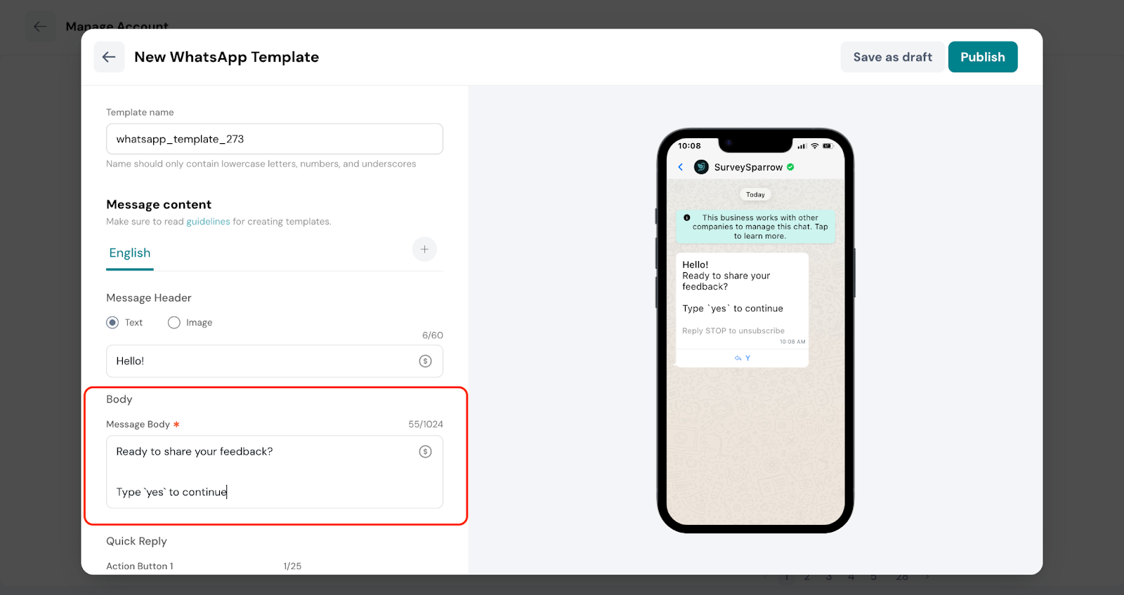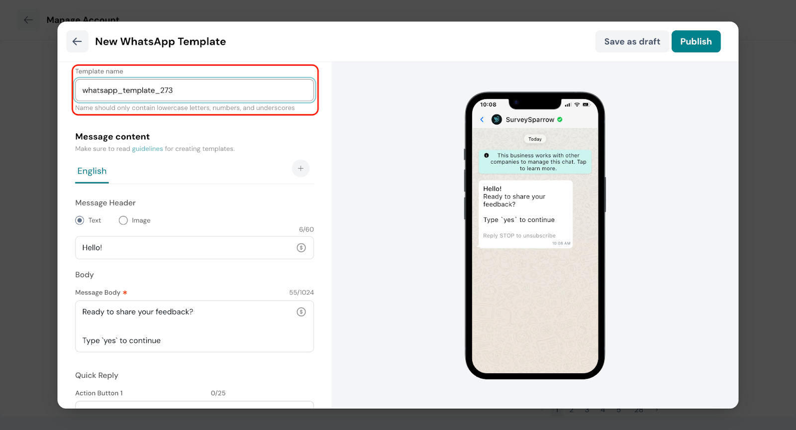 Templates ensure the message complies with WhatsApp’s business policies and helps prevent spam. Before you can send out surveys or notifications through WhatsApp, you'll need to create and get your template approved.