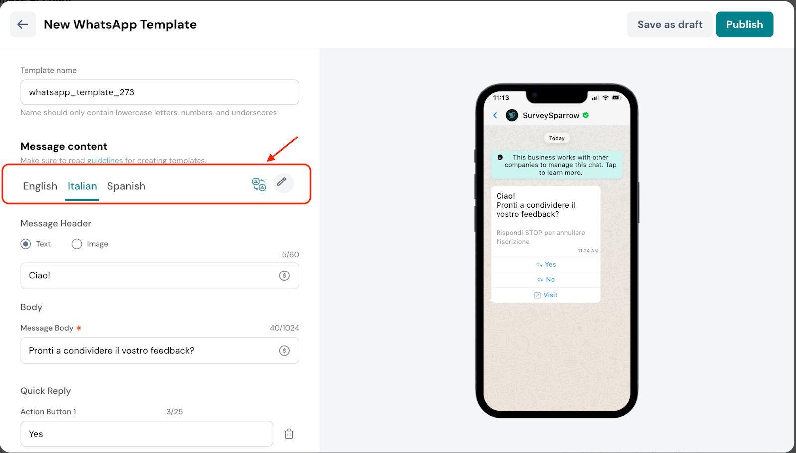 Once you've set the language and completed the message content, click Publish to submit the template for approval from Gupshup.
