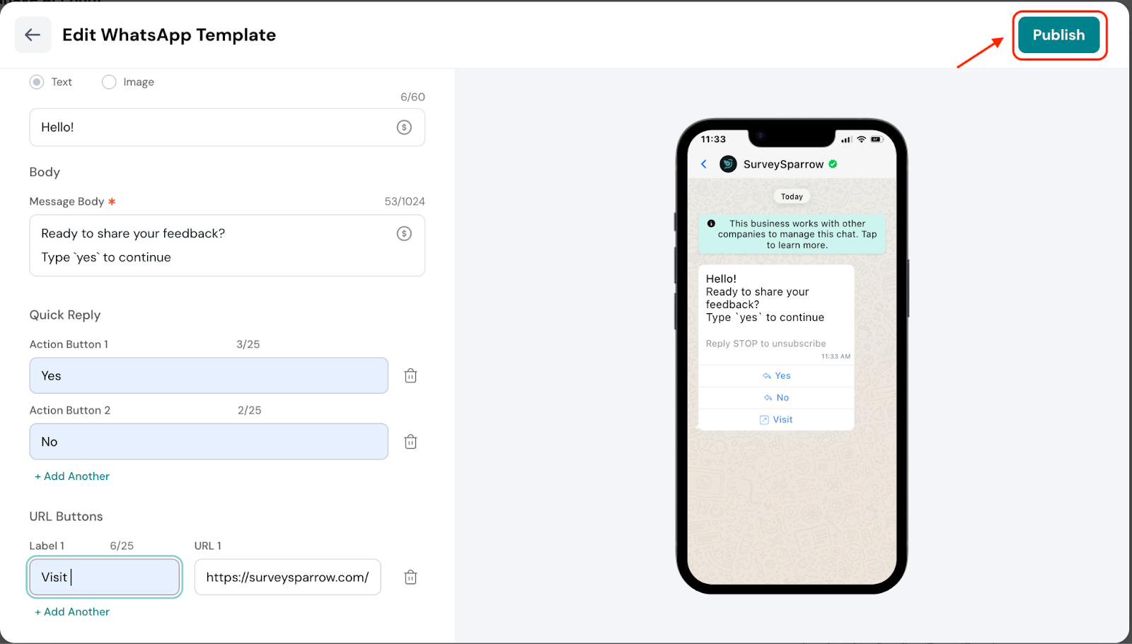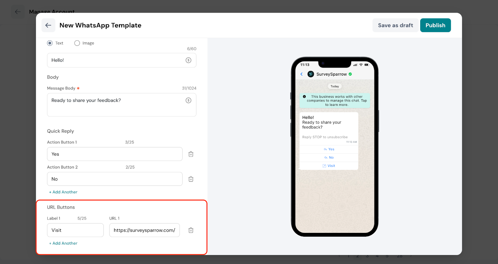 URL Buttons: A URL button lets you include a clickable button in your WhatsApp message that opens a webpage when tapped. It’s useful when you want to direct customers to an external link, such as a survey, a product page, your website, or a payment link.