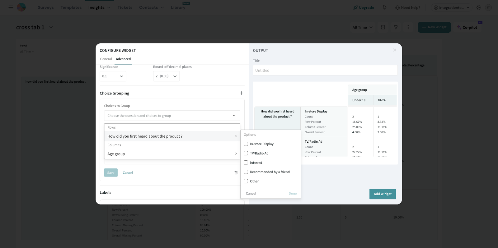 Note: Means are not available when answer grouping or nesting is applied.16. Labels: Customize the display names of individual rows and columns to make your Crosstab report easier to interpret for your audience.