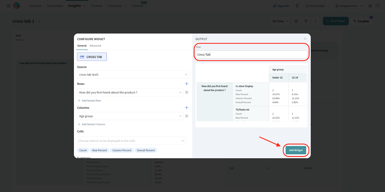 Click on the Cells dropdown to select which data points you'd like displayed in each cell of your Crosstab.