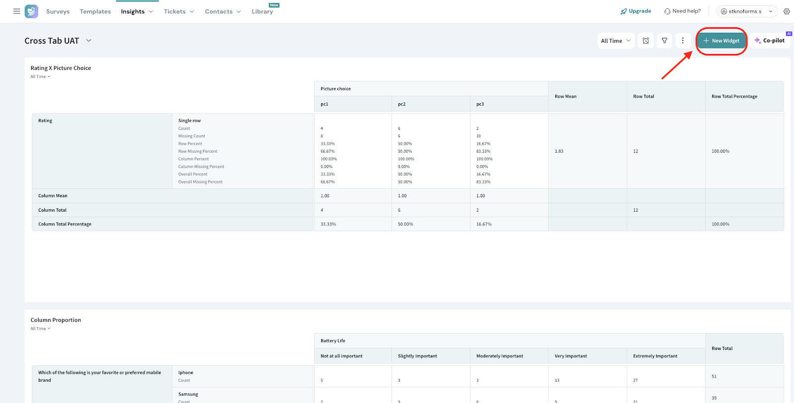 A Crosstab report lets you compare responses from two or more survey questions by displaying one or more questions as columns and one or more questions as rows. This format helps you analyze how different groups of respondents answered across questions, making it easier to identify trends, patterns, and relationships within your survey data.