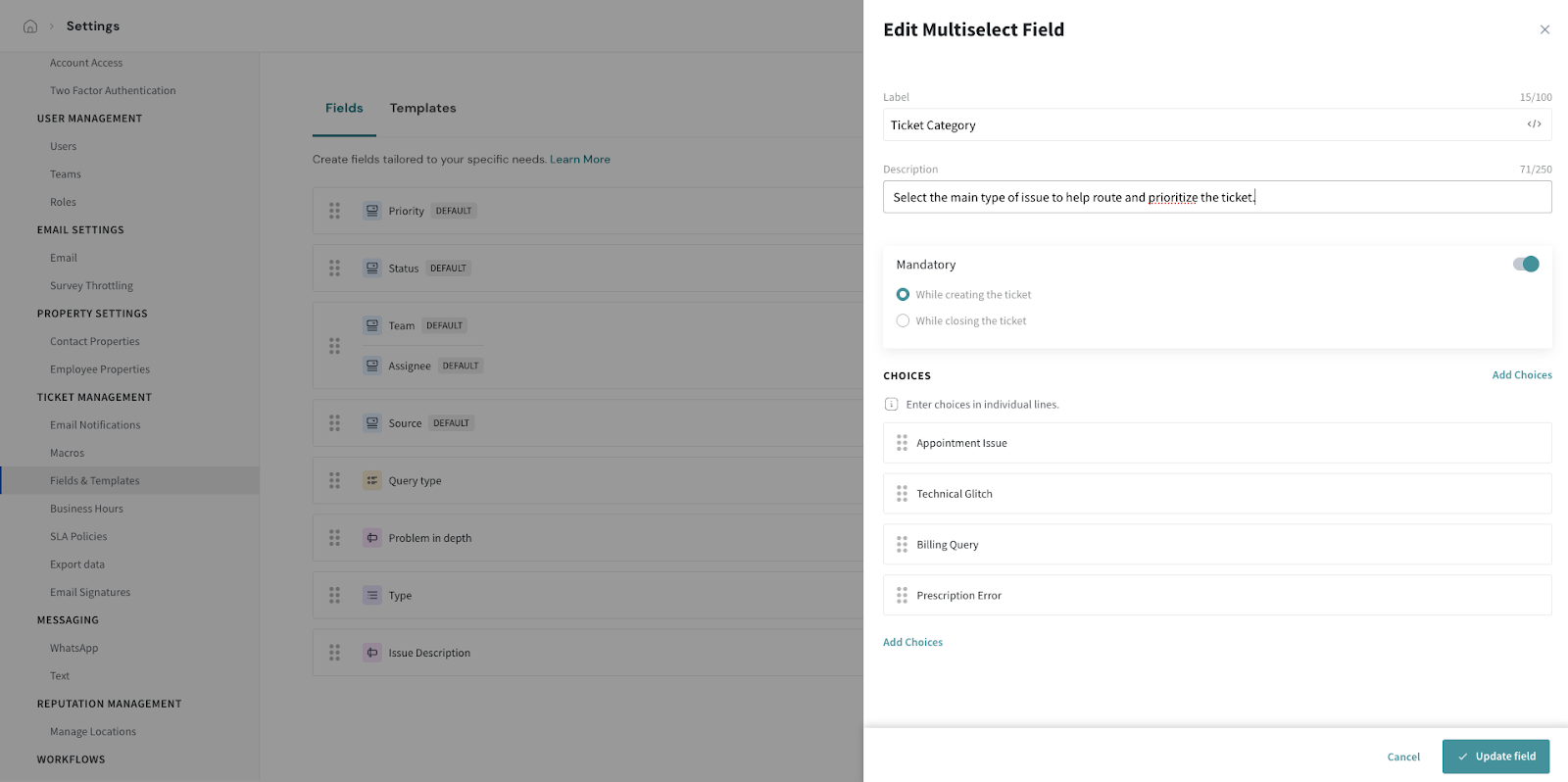 - Navigate to Settings and select Fields & Templates under the Ticket Management module.