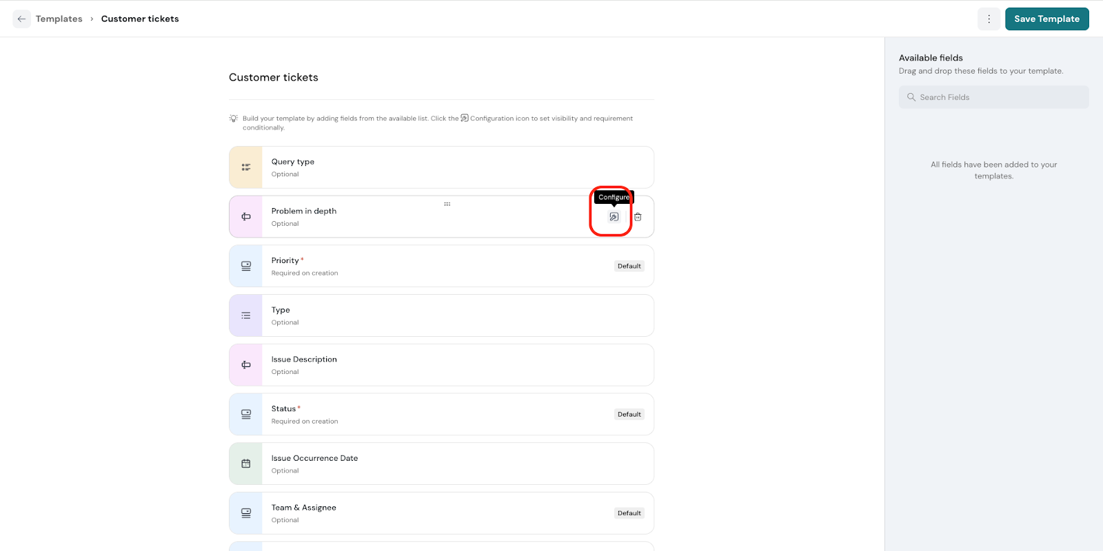 5.5. For each custom field, you can configure its visibility settings. Click the Configure icon on the respective field to set when it should appear based on user input.