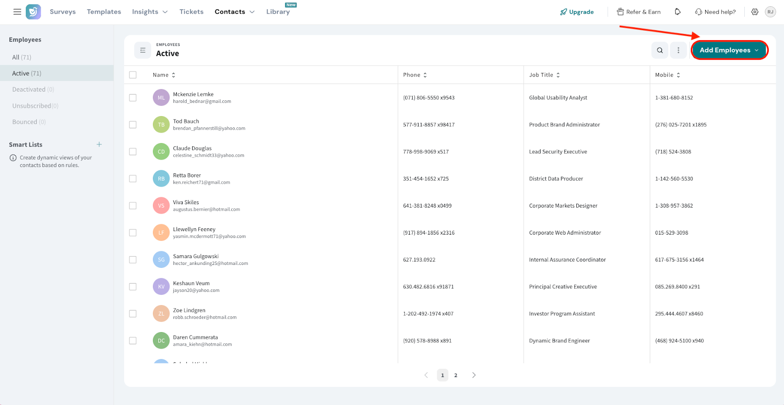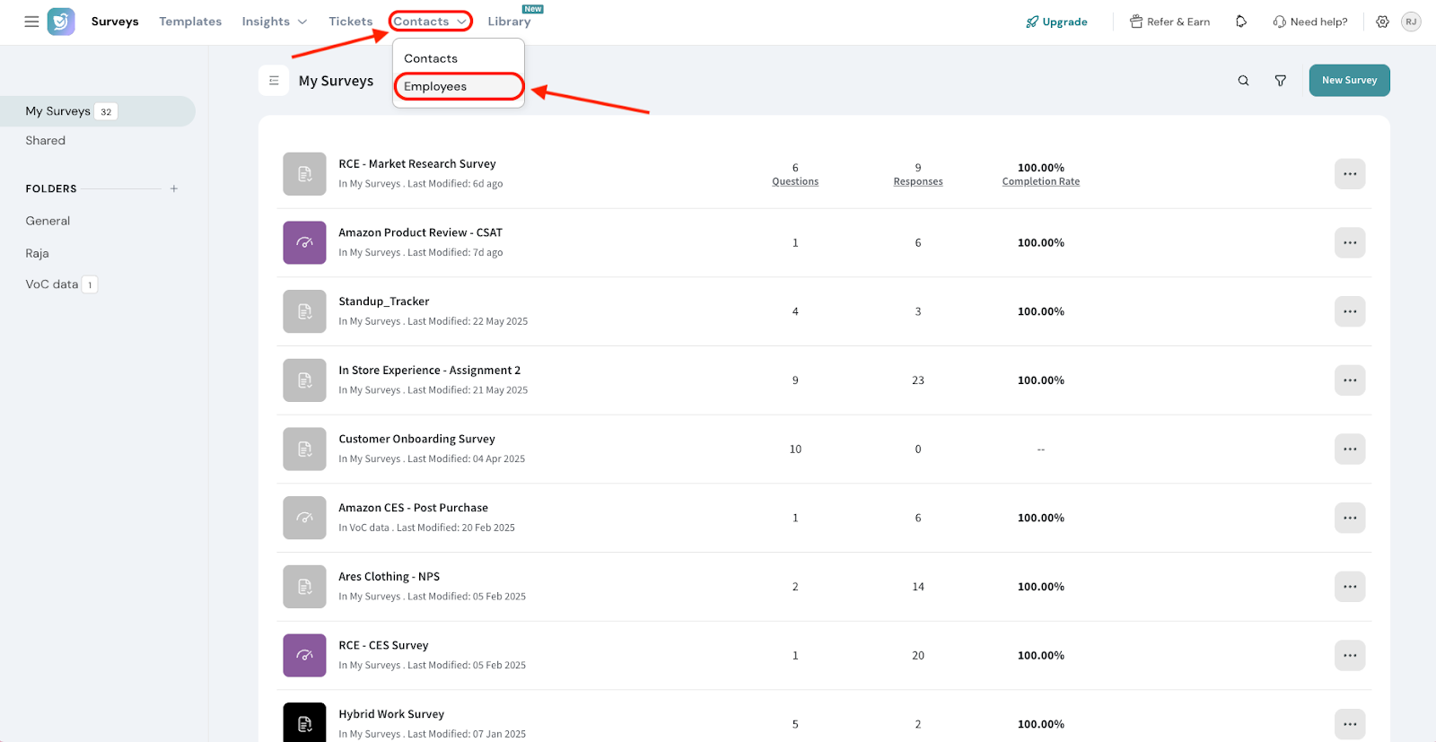 1. Inside the SurveySparrow app, open the Contacts menu, then select Employees.