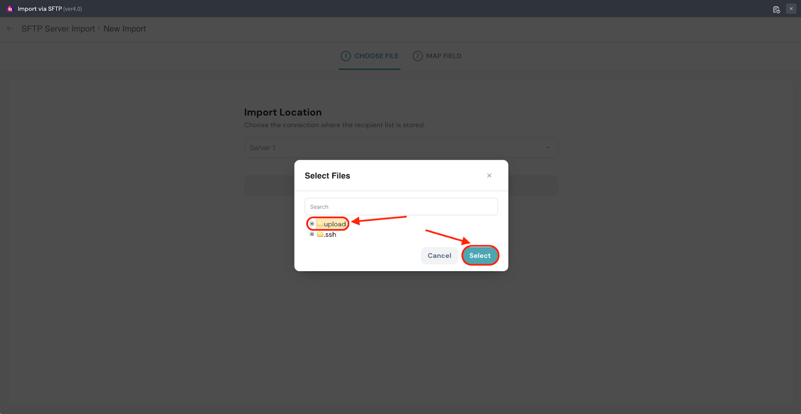 8. The file directory of the SFTP server opens up. You will see folders, which you can open to see the inner files. To do this, click on one of the folders, then click Select.
