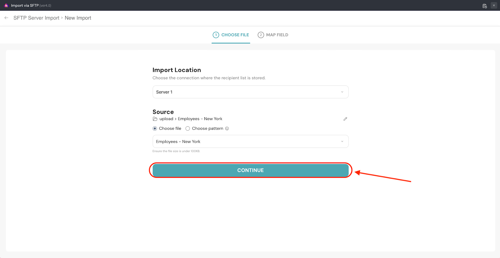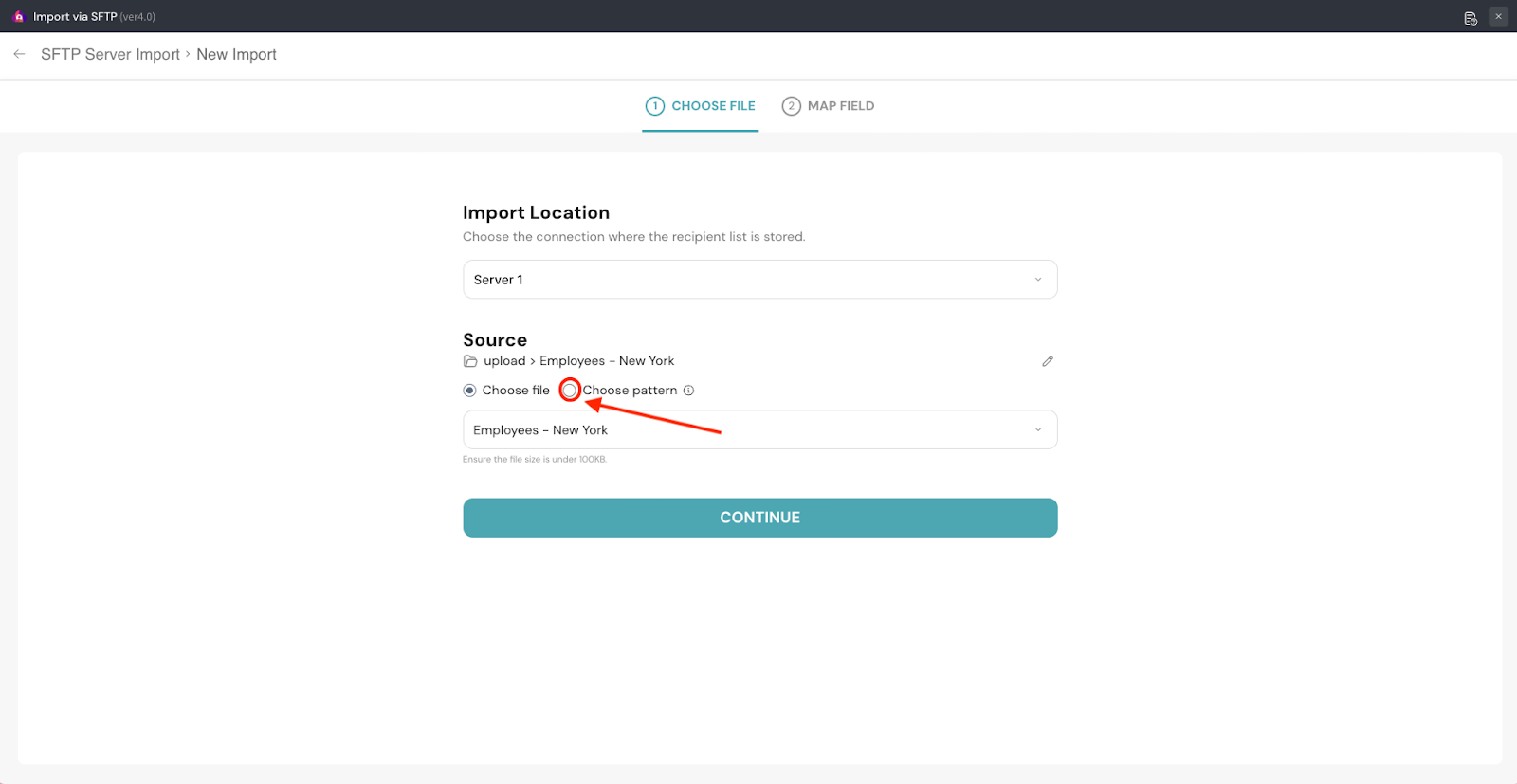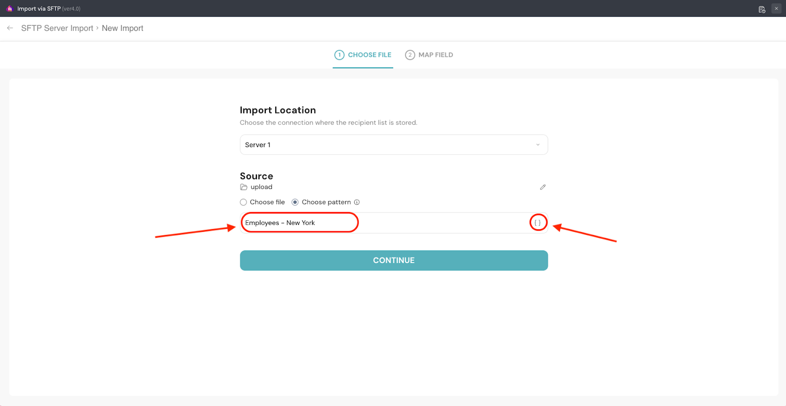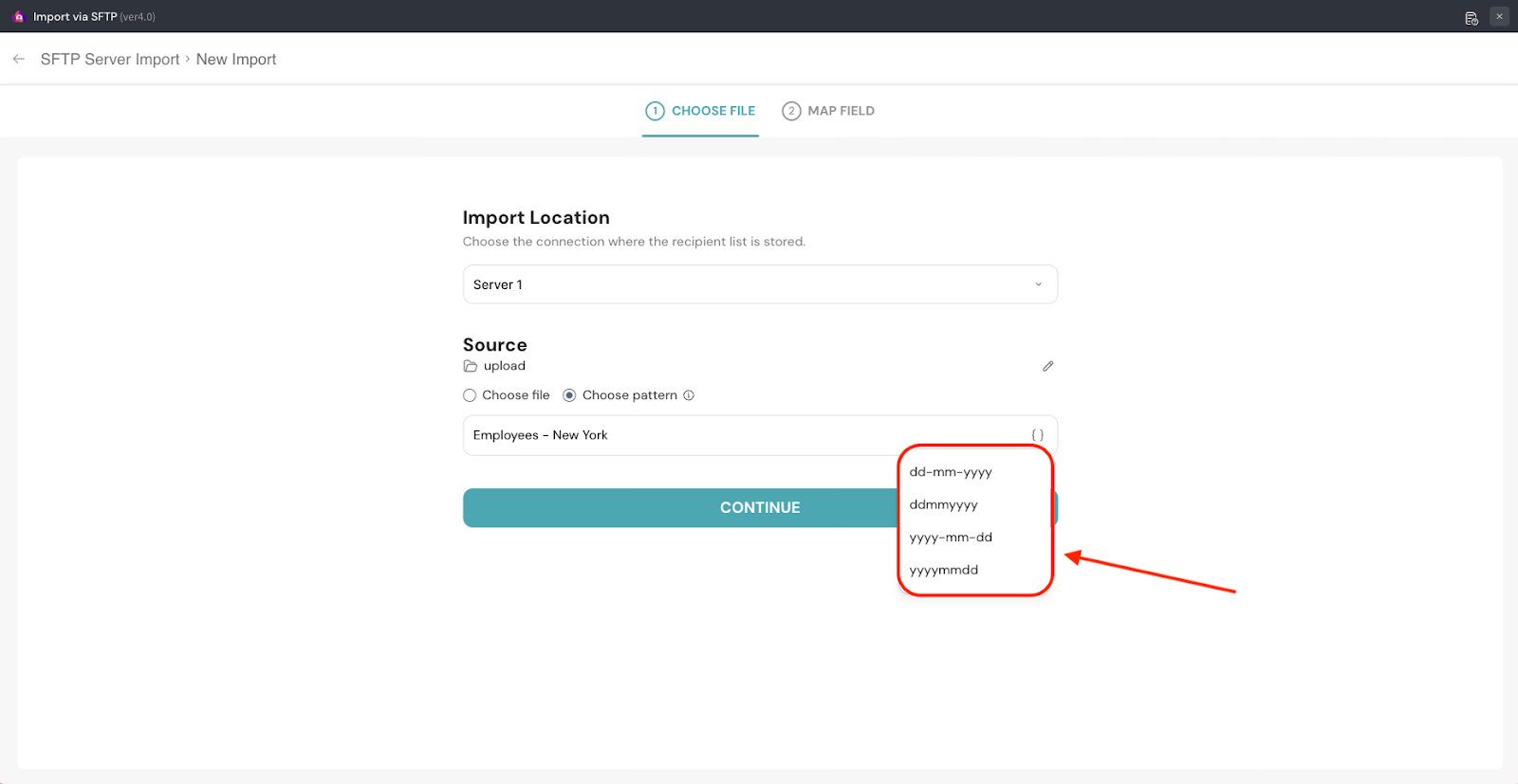 Note: If your list has different date-based versions, you can create a dynamic name pattern. This helps SurveySparrow identify and pull files matching it from the SFTP server. To do this, click Choose Pattern.