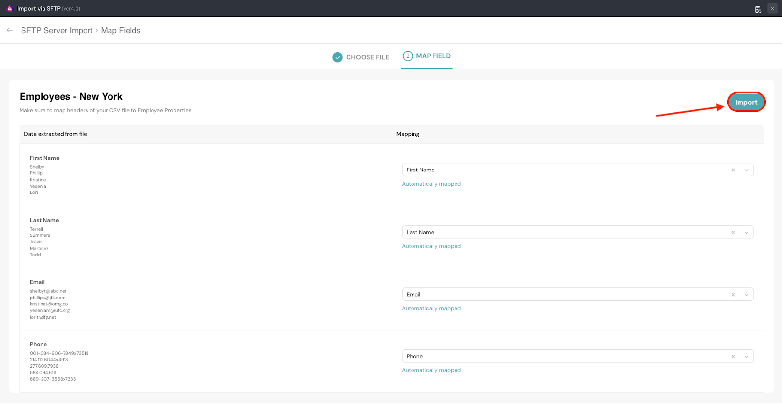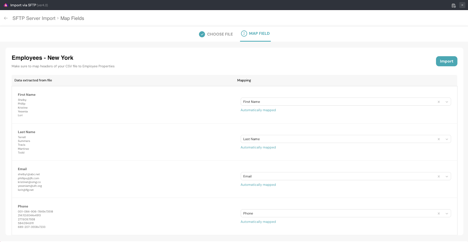 11. You will proceed to the mapping section, where each of the employee details from the CSV gets mapped to the corresponding field inside SurveySparrow.
