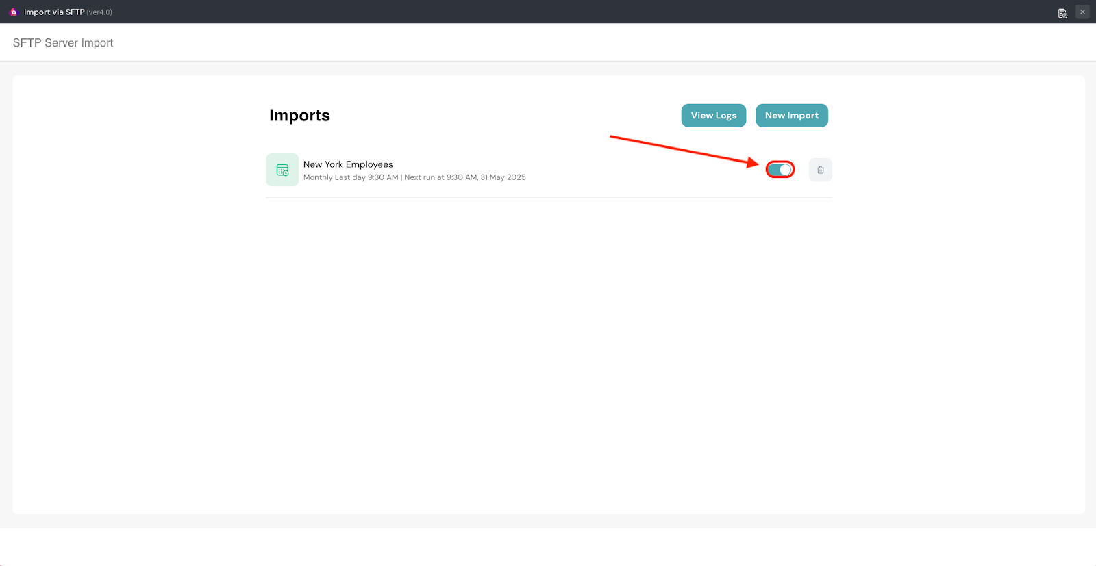 19. To pause an import, hover over it. You will see a green toggle, which you must click.